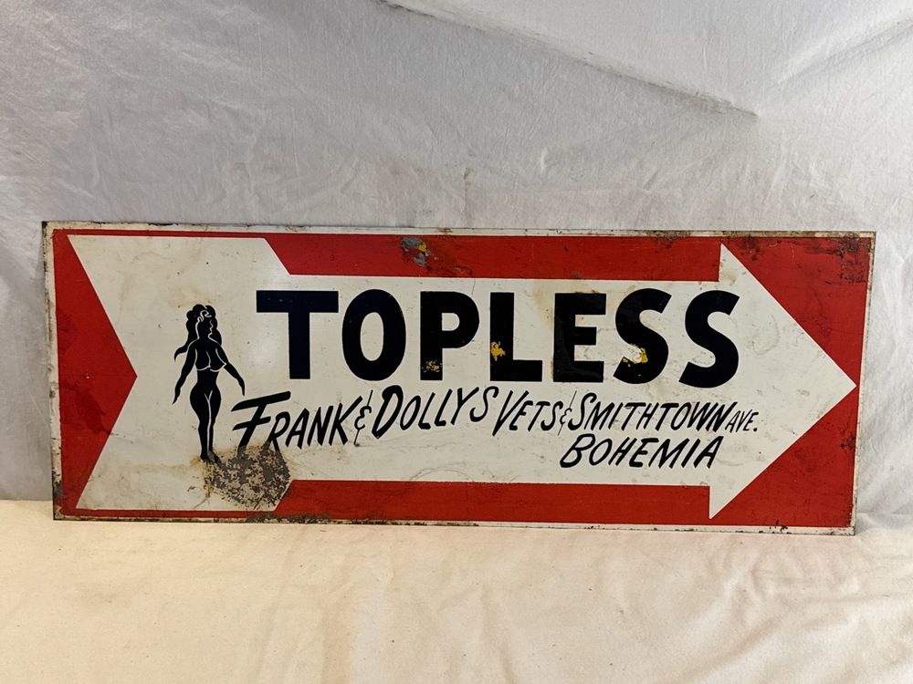 Vtg. Tin Advertising Sign “Topless, Frank & Dollys Vets & Smithtown Ave. Bohemia” ~ 24” x 9”