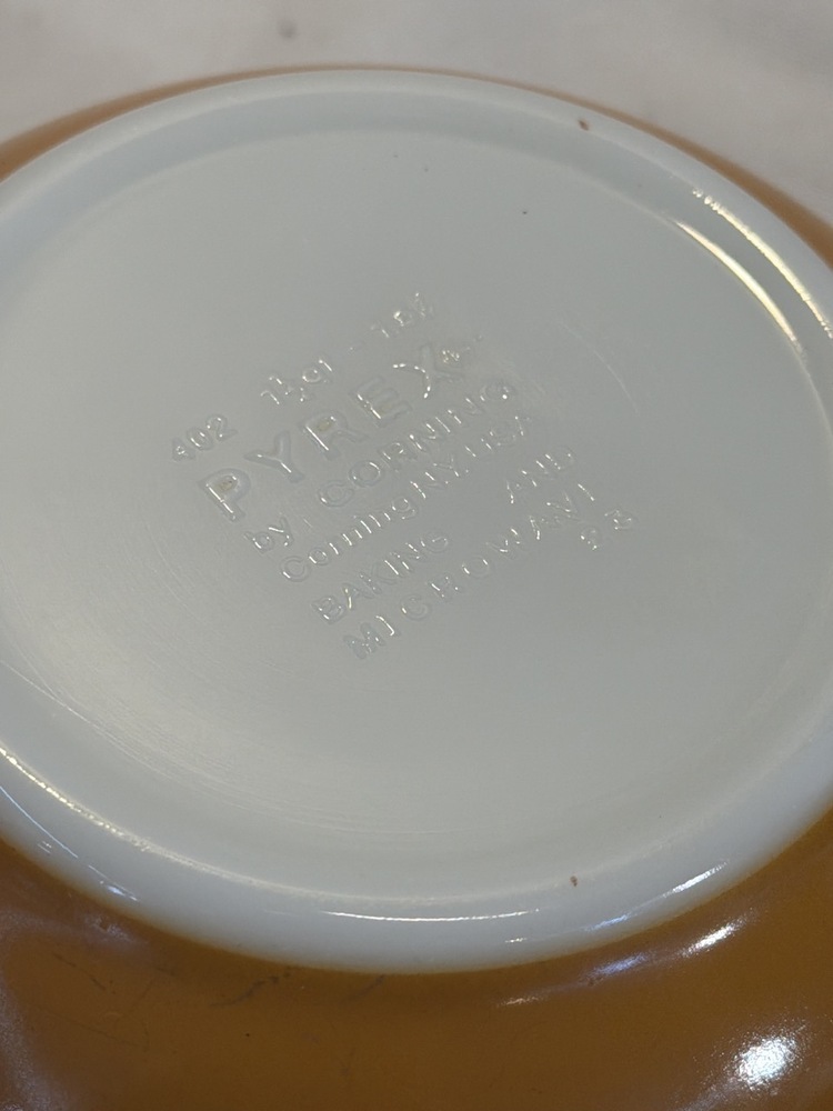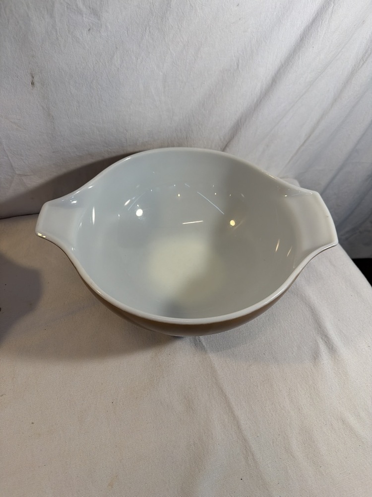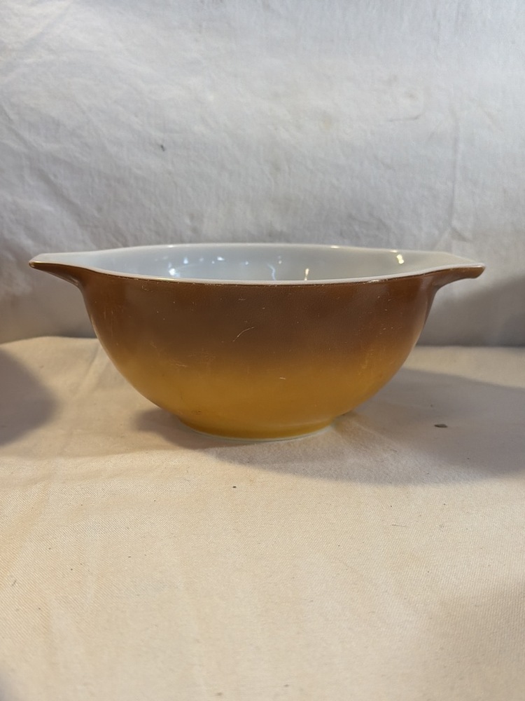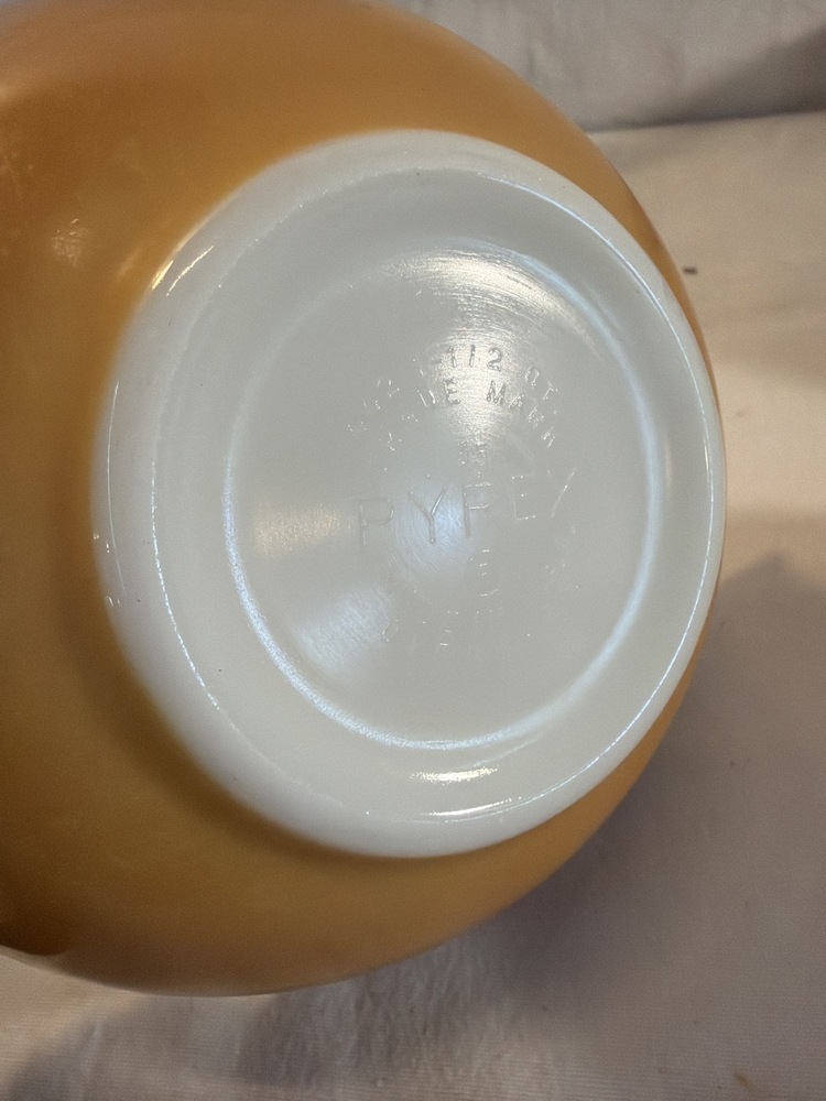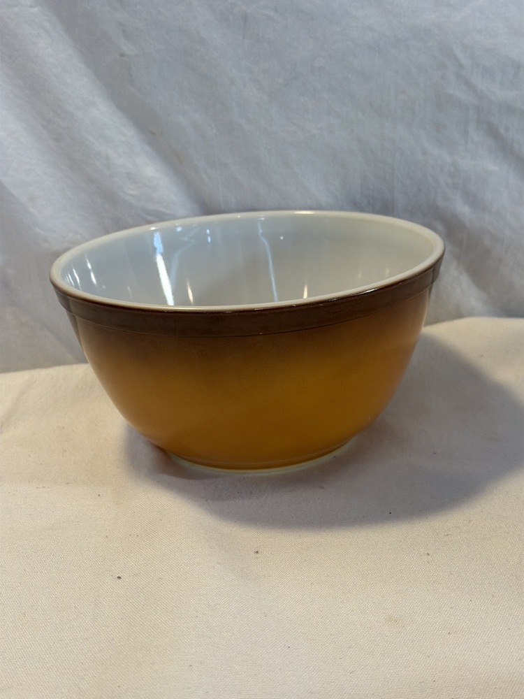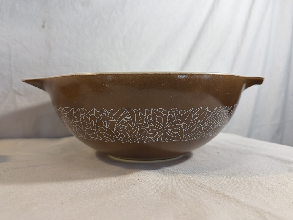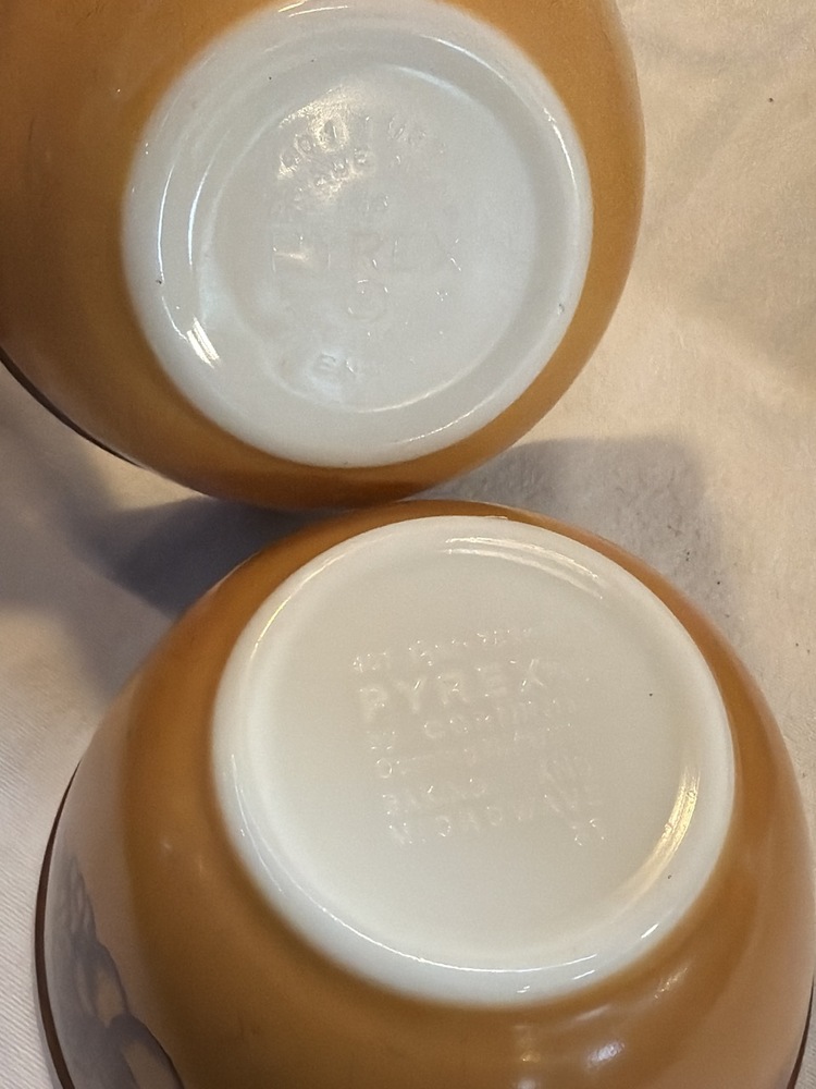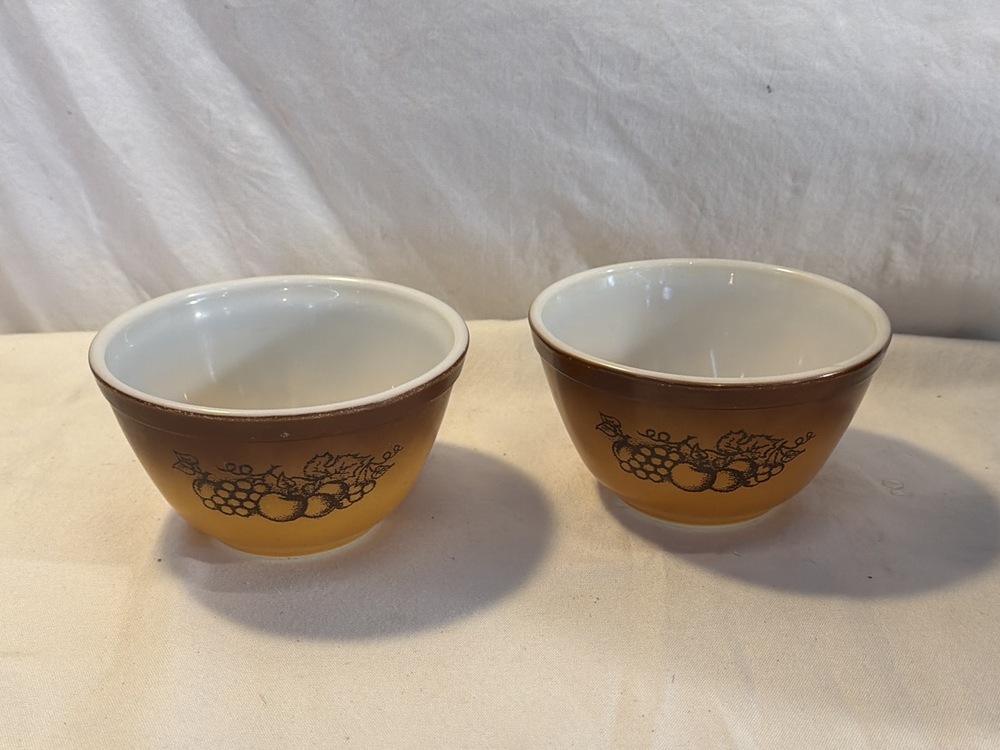 Vtg. Pyrex Mixing Bowls including “Old Orchard” 2) 441 1 1/2 pt., 442 1 1-2 qt , 442 1 1/2qt Cinderella and “Woodland” 444 Cinderella bowl