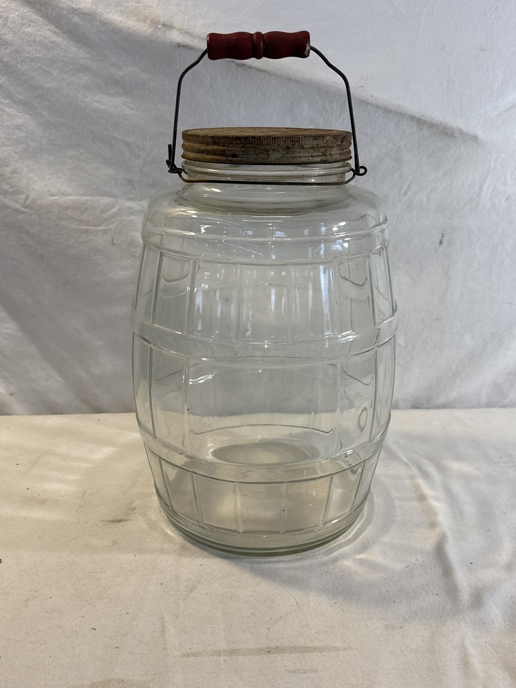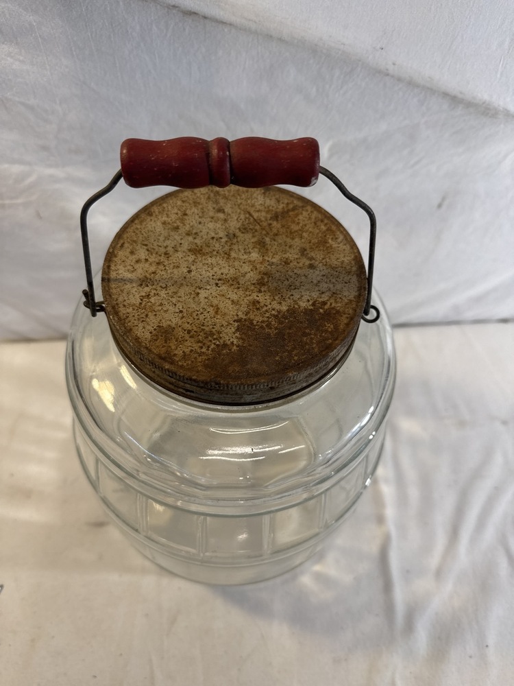 Vtg. Glass Country Store Jar - Metal lid ; Wood Handle - 16” to top of handle