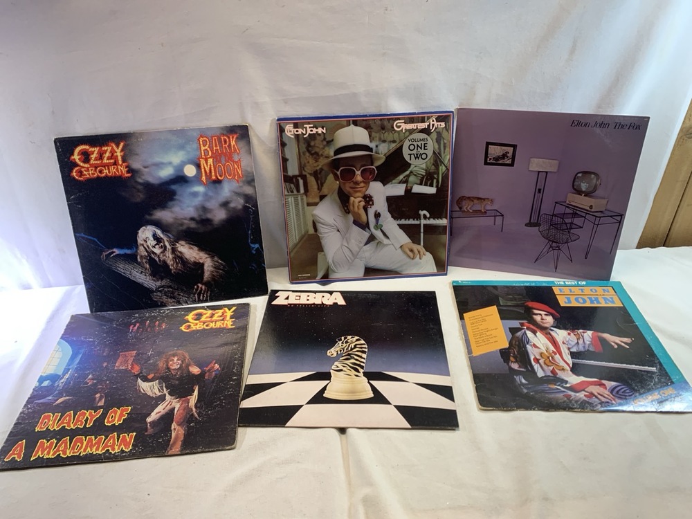 6 Record Albums including Elton John Greatest Hits, The Fox & The Best of Elton John/ Zebra No Tellin’ Lies/ & Ozzy Osborne Bark Moon & Diary Of A Madman