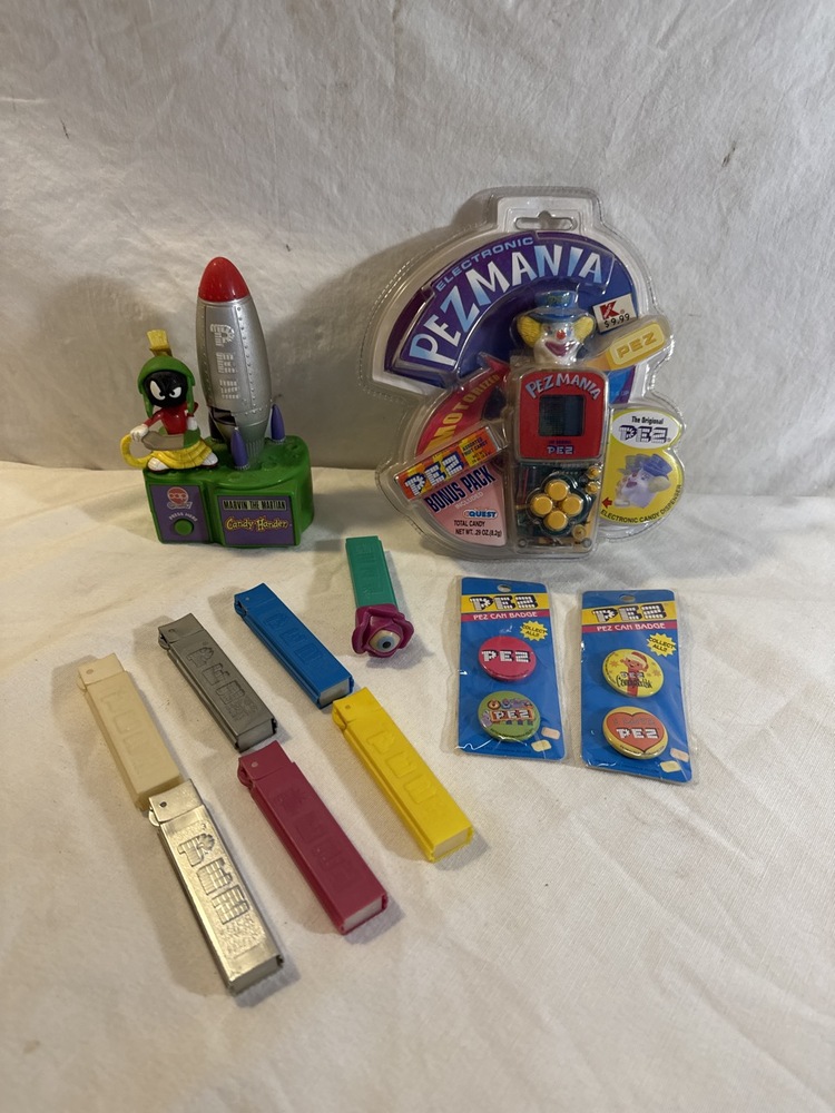 Vtg Pez Lot including Marvin The Martian, Pezmania, “Regular” Pez, Pez Can Badges, Psychedelic Flower