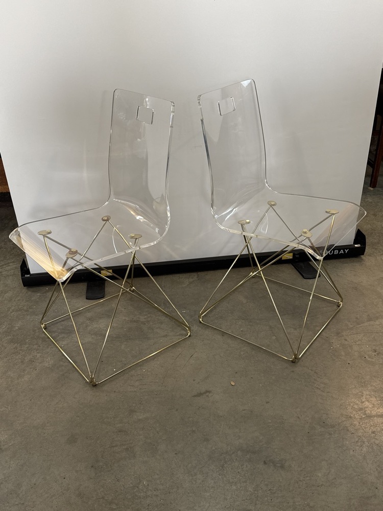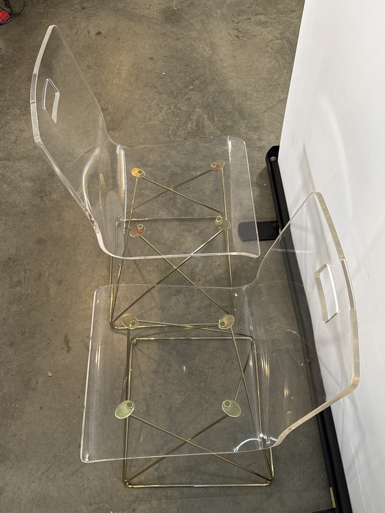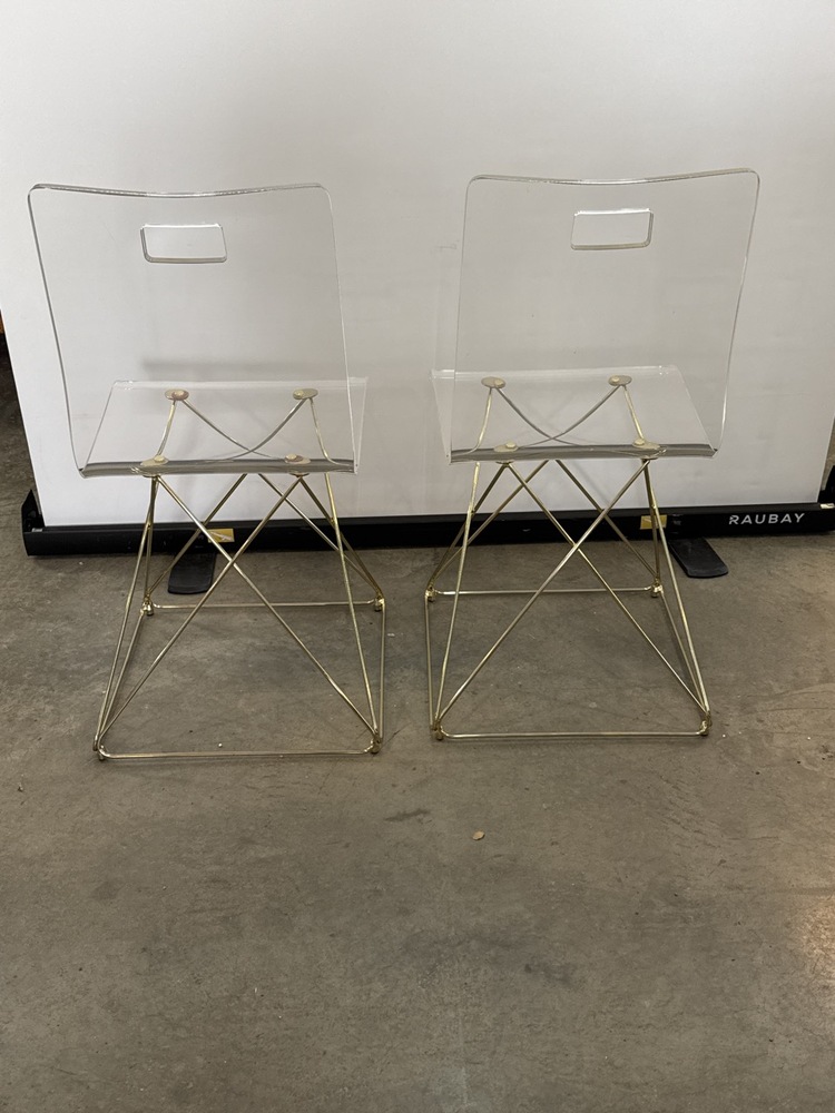 Pr. Pottery Barn Teen Clear Acrylic Side Chairs with Gold Frame aka “Gabby Johnson Dining Chair” - 18” Seat x 33 1/2” to top x 16” wide