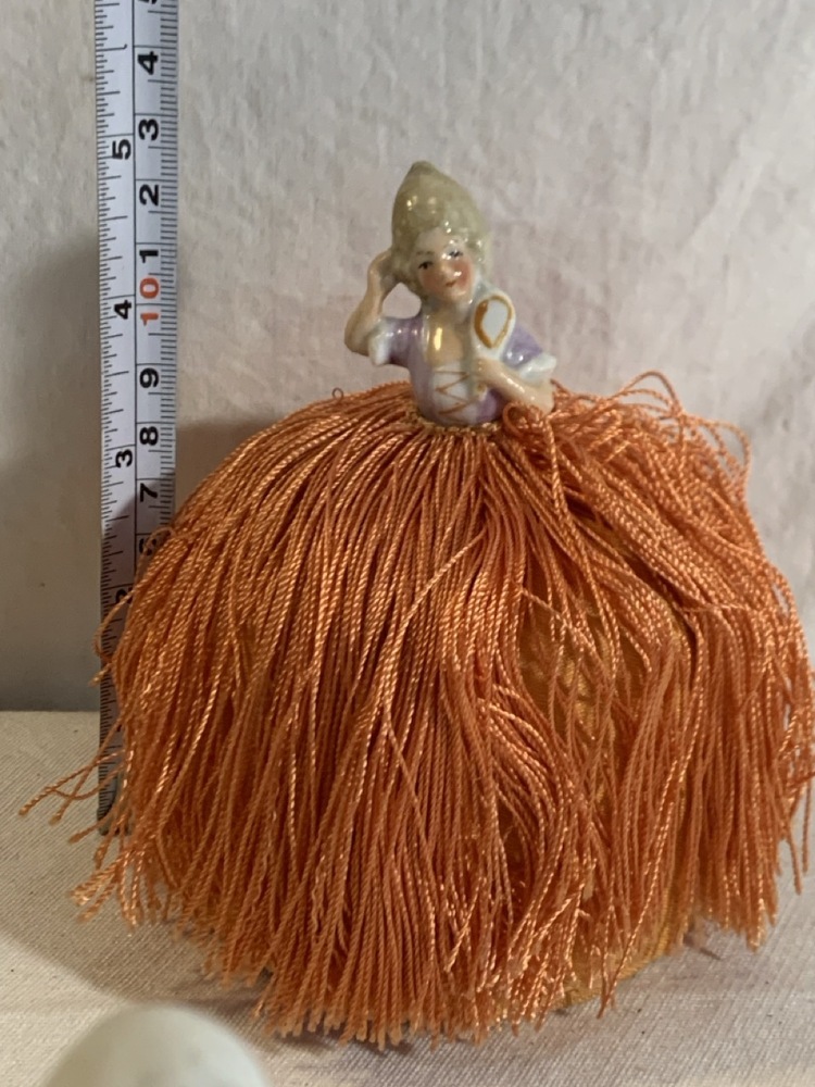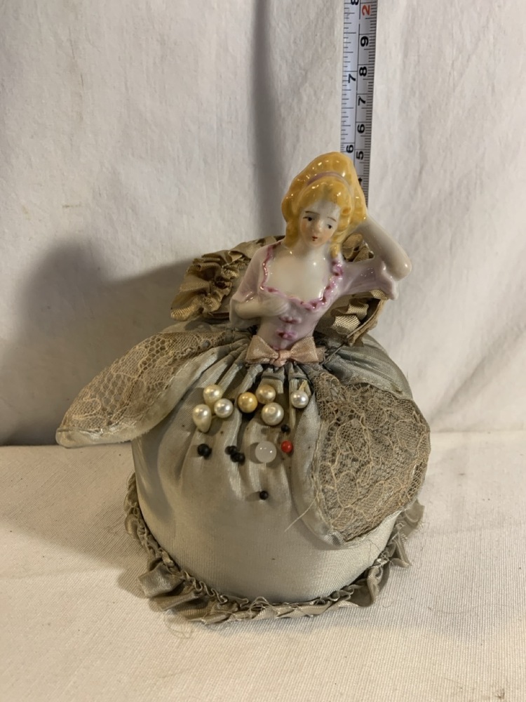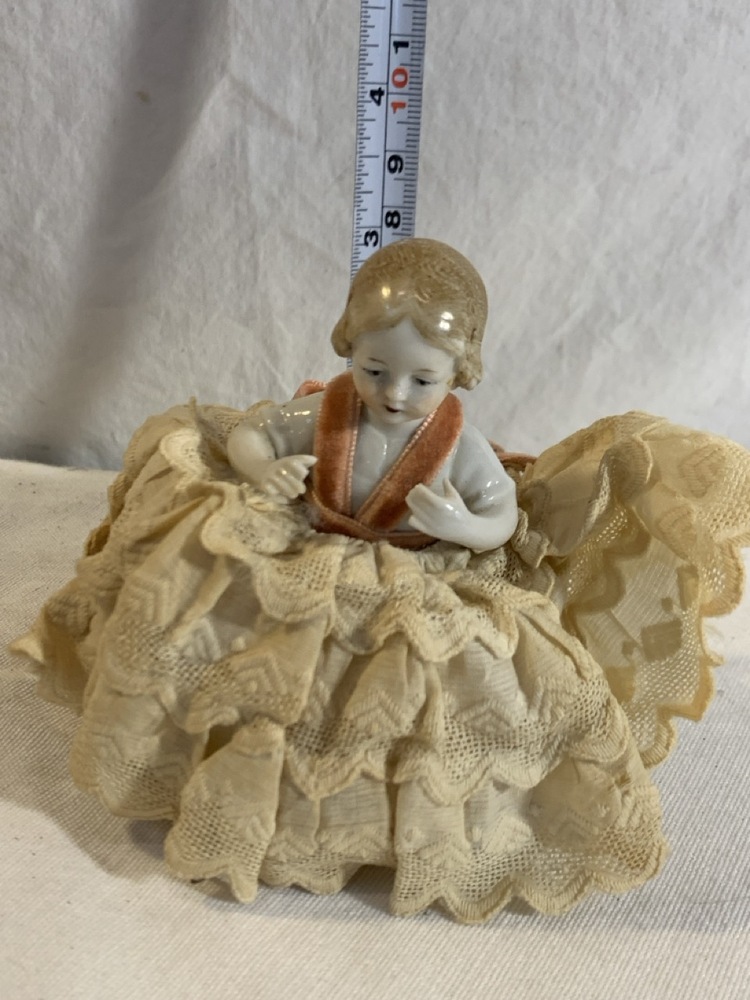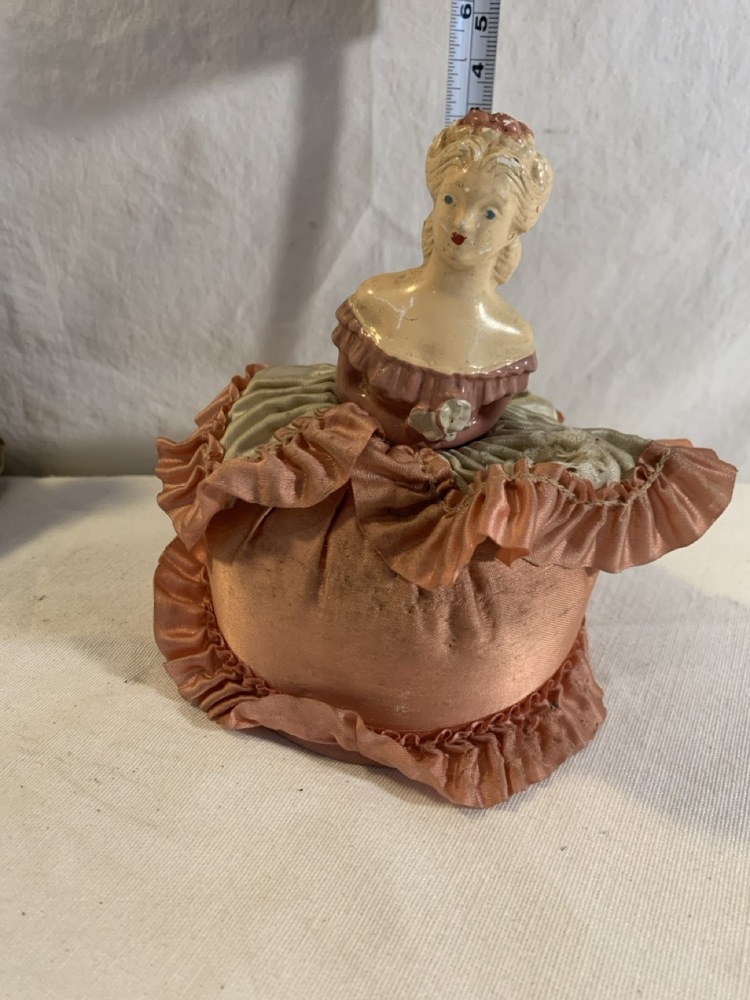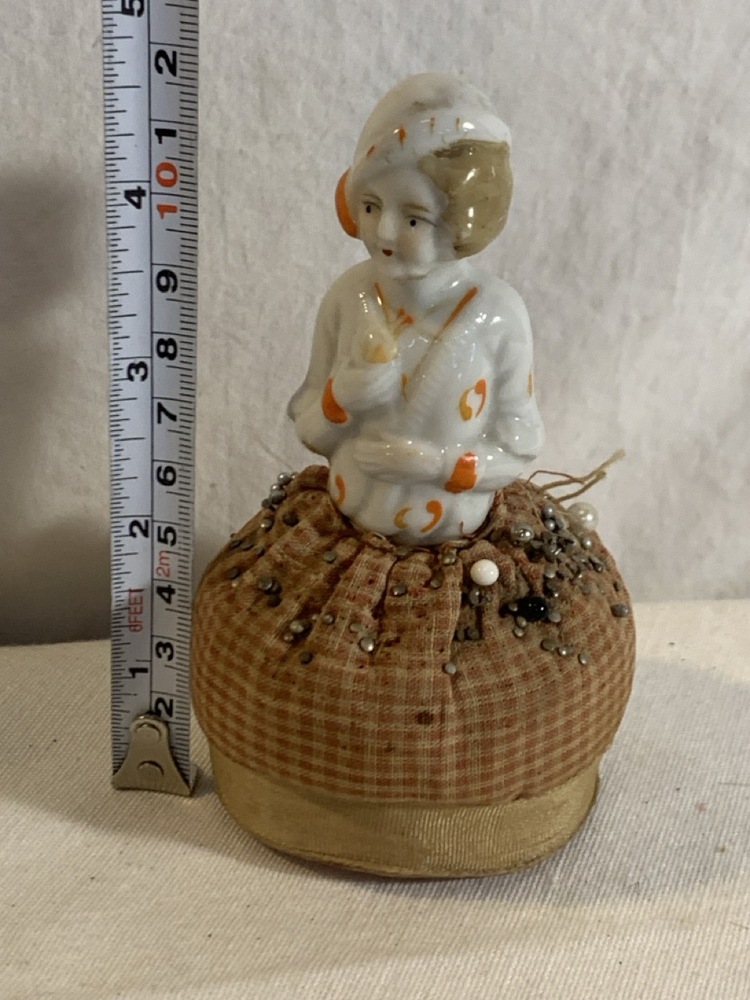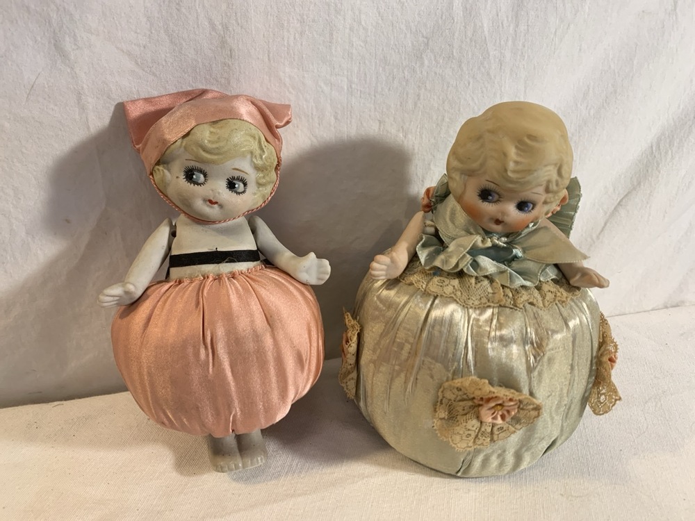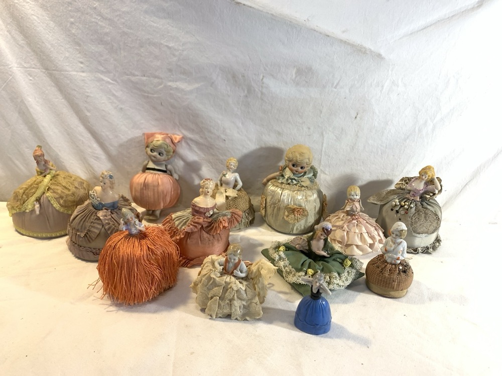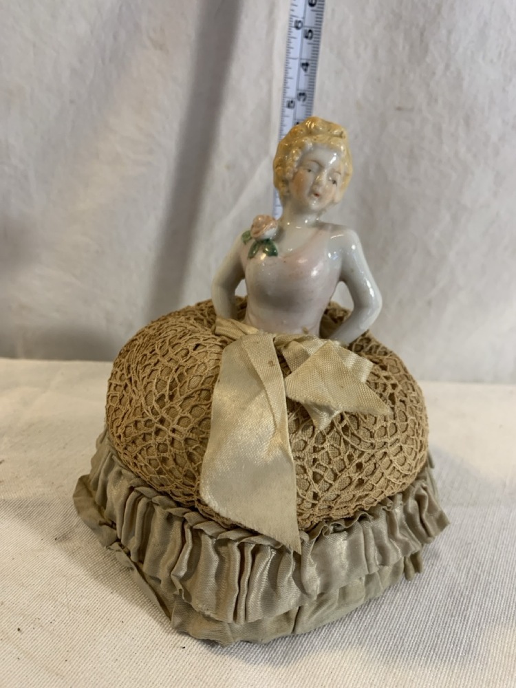 Collection of Bisque & Porcelain Doll Pin Cushions including Kewpie, Porcelain half Doll, & Germany Perfume Bottle