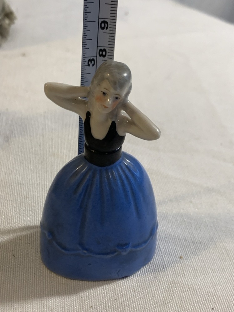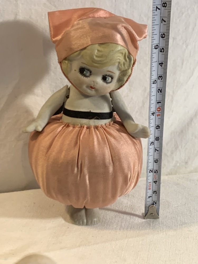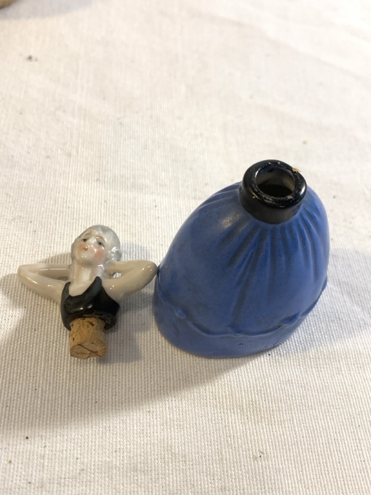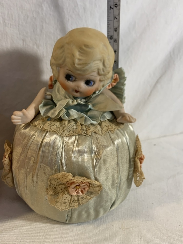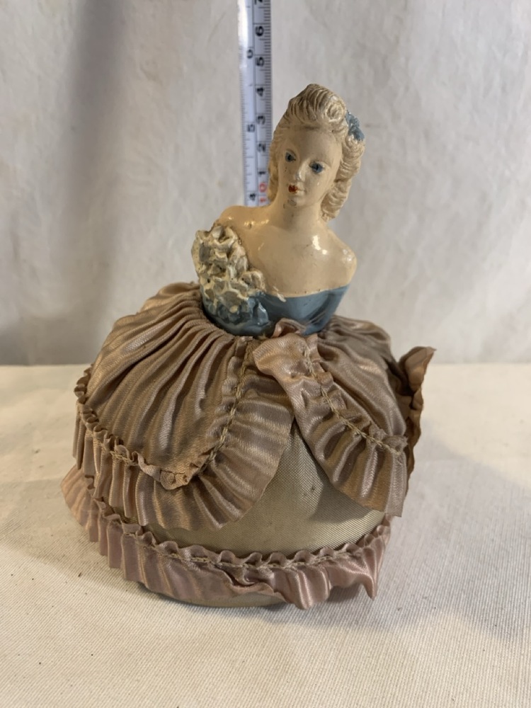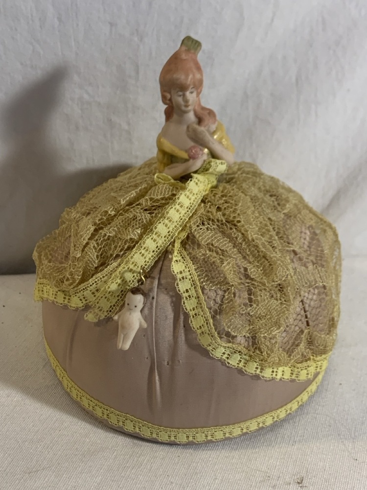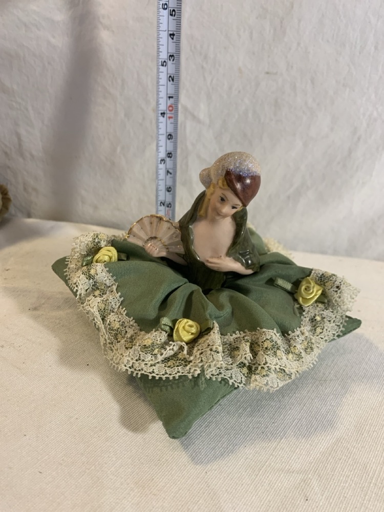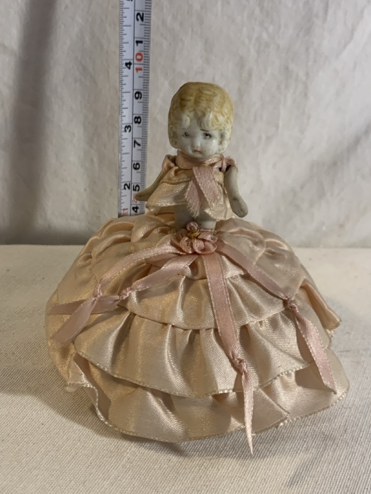 Collection of Bisque & Porcelain Doll Pin Cushions including Kewpie, Porcelain half Doll, & Germany Perfume Bottle