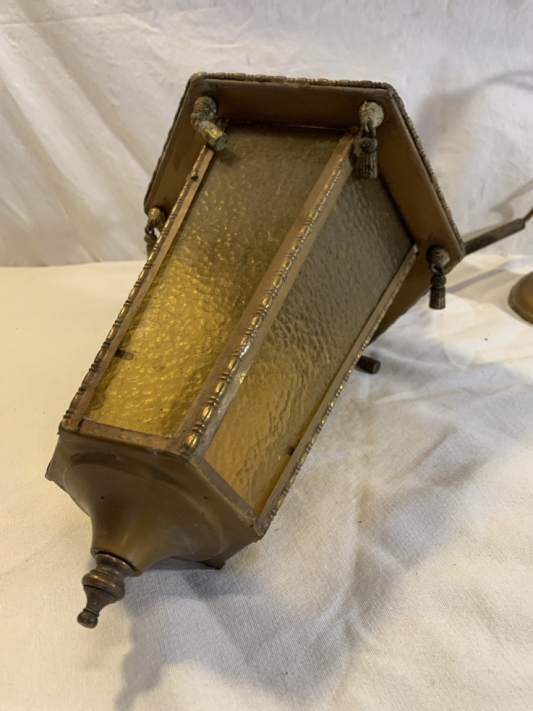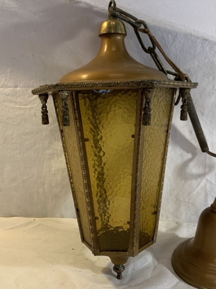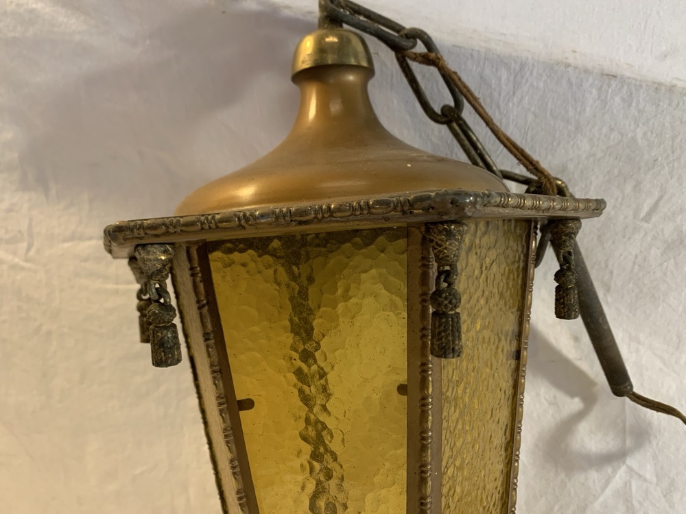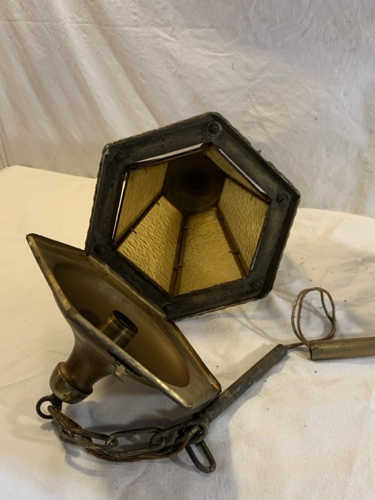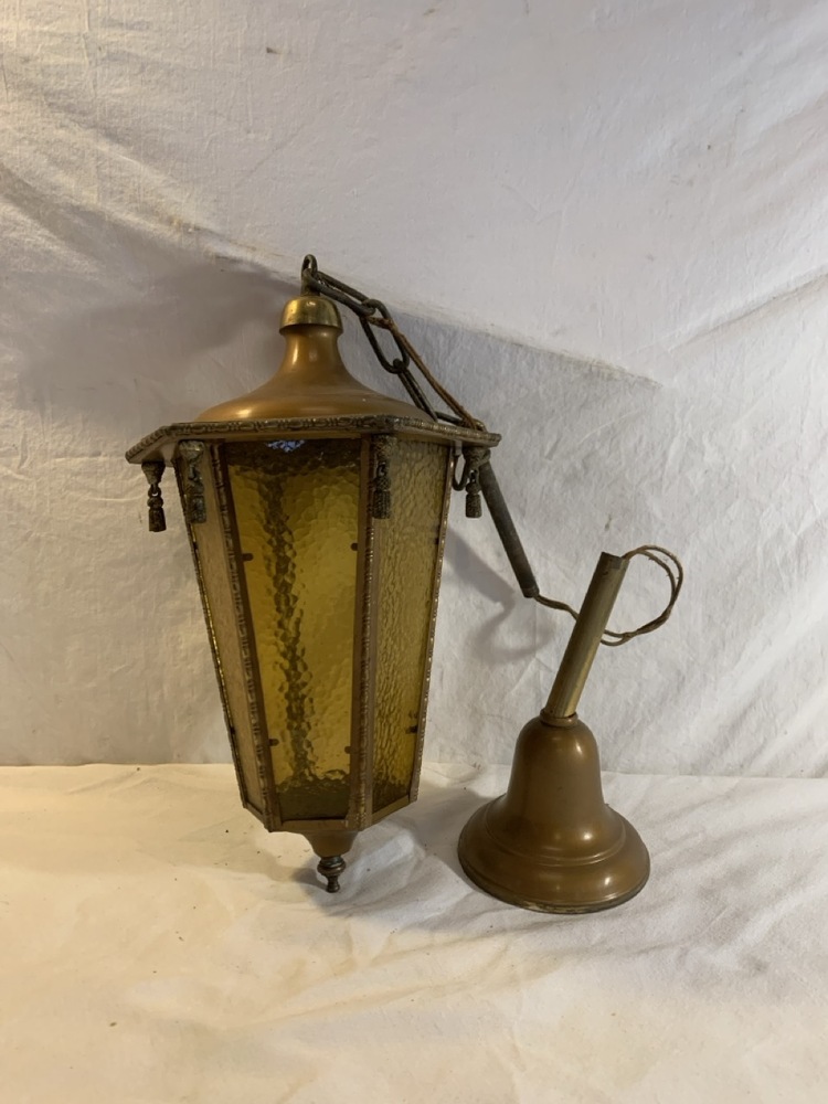 Antique Brass Pendant Hanging Light - Amber Glass- 16” Tall