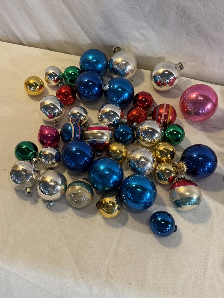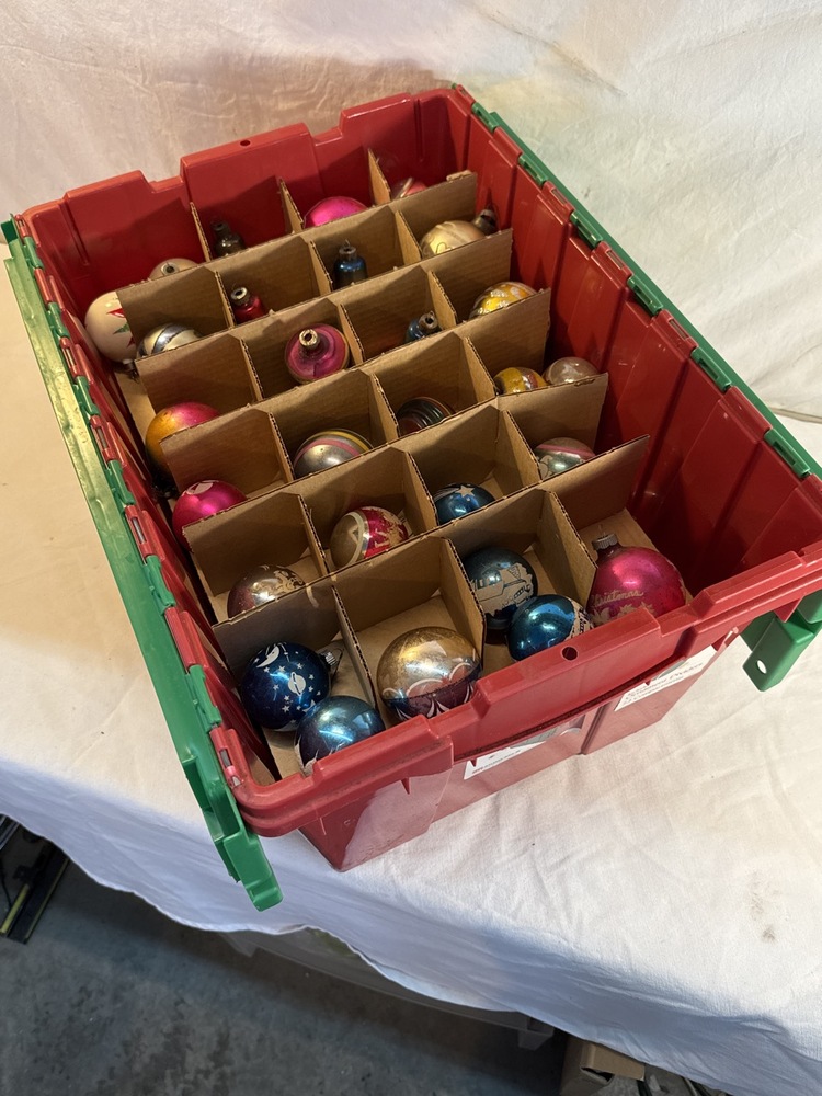 Vtg. Christmas Glass Ornaments in Ornament Divider Tote