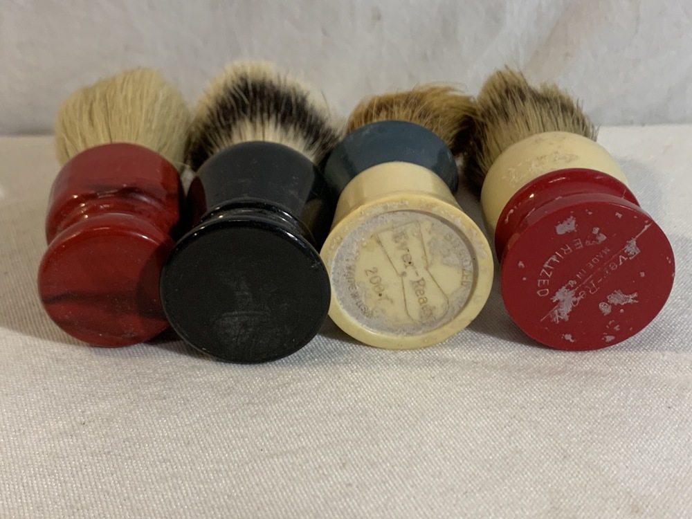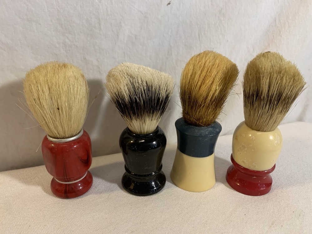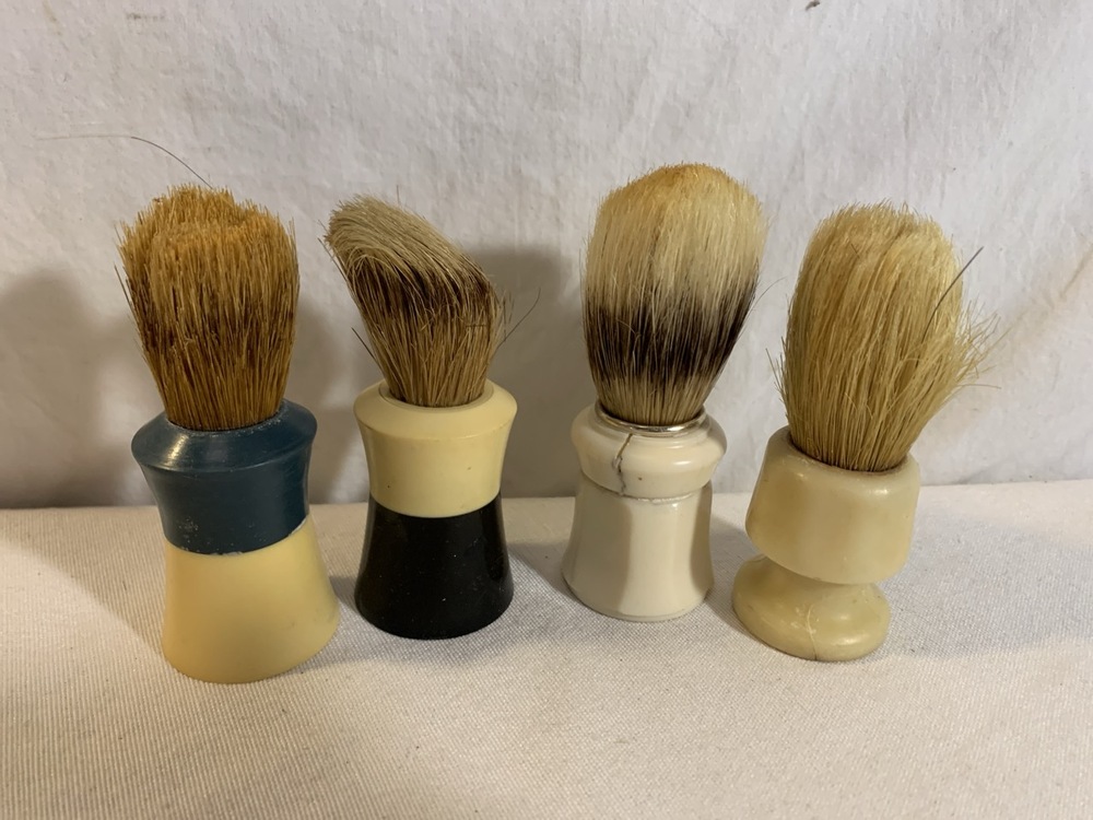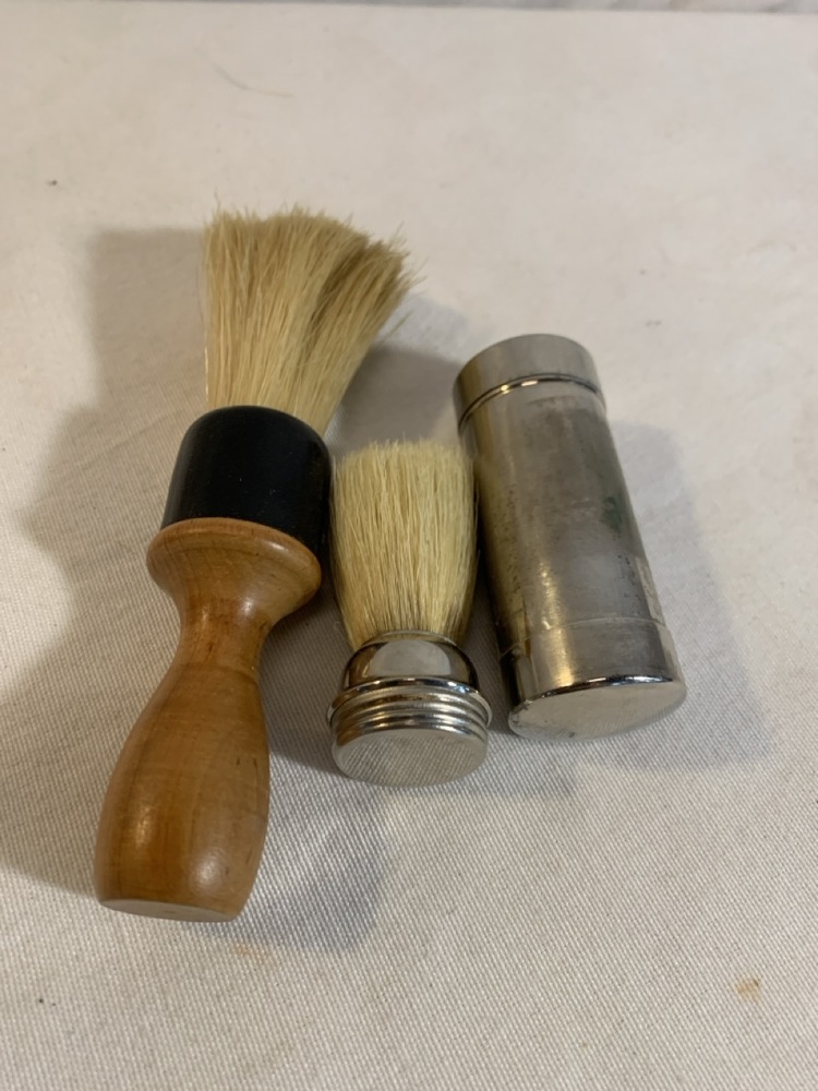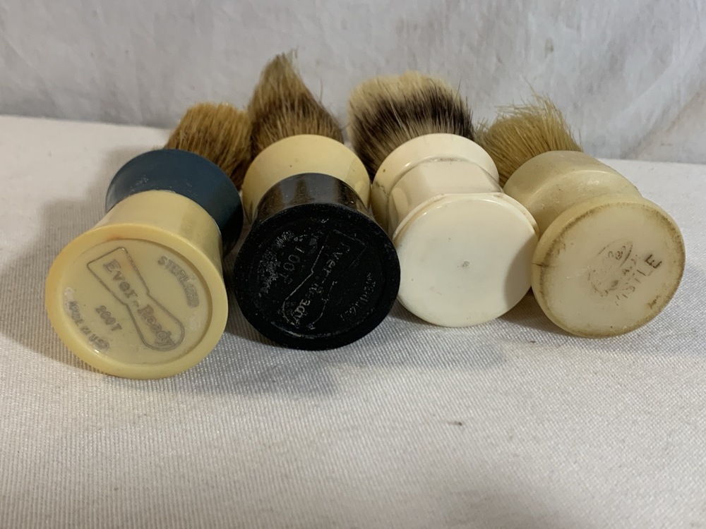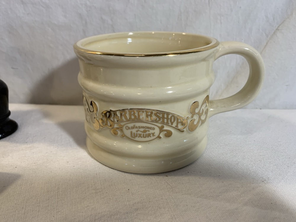 Antique Barber Bottles, Shaving Mugs, & Brushes including Witch Hazel Bottle, Barbasol Jar, Hair Dye Bottle, Shaving Mugs, Horse Hair Brushes, Talc Shaker