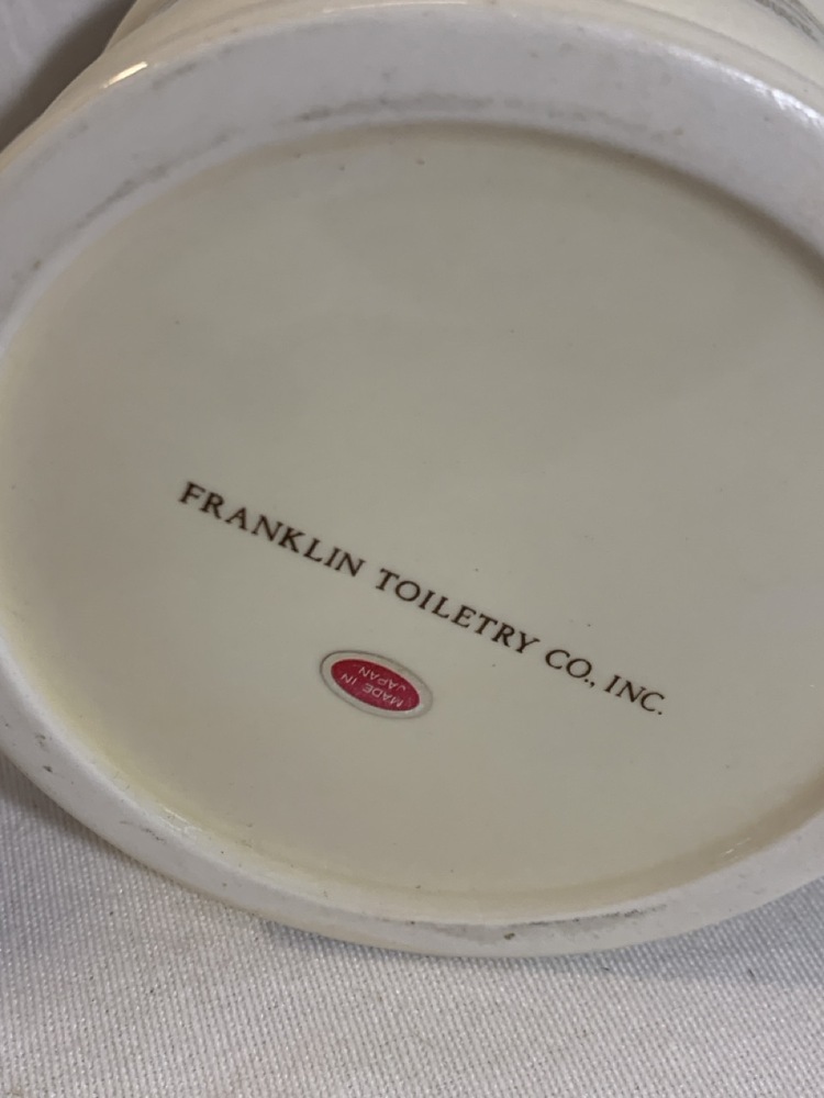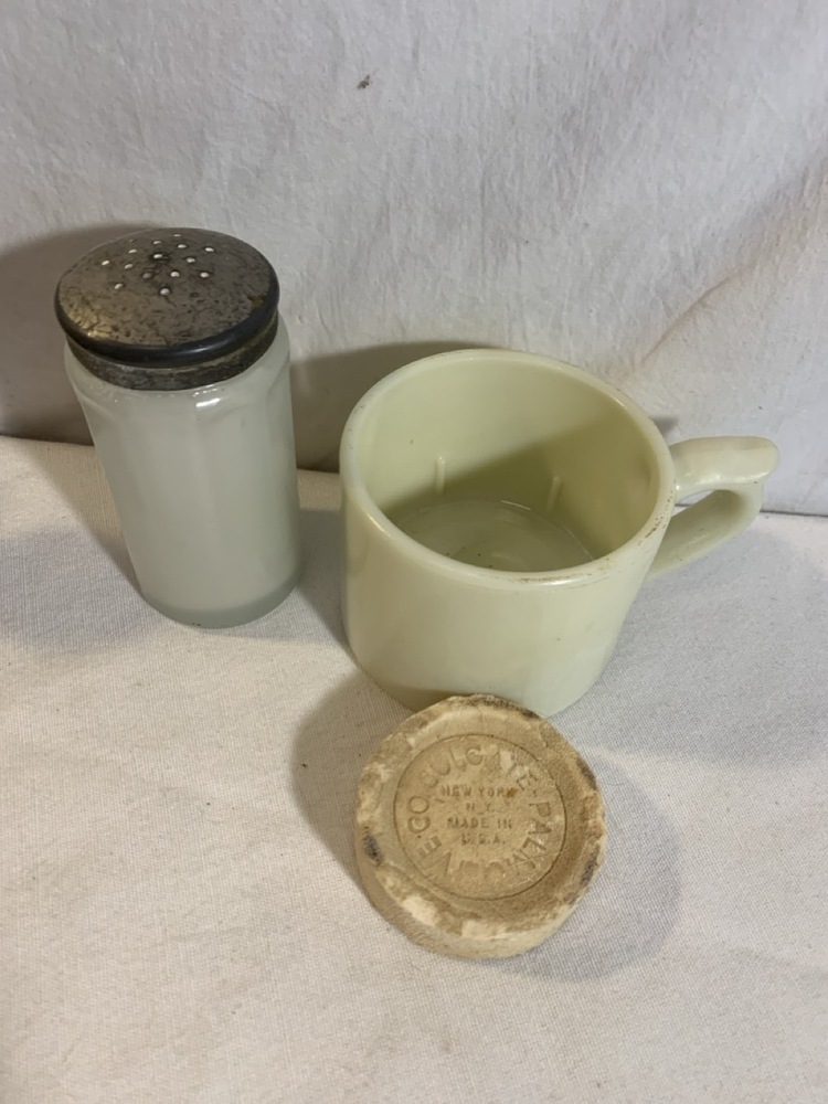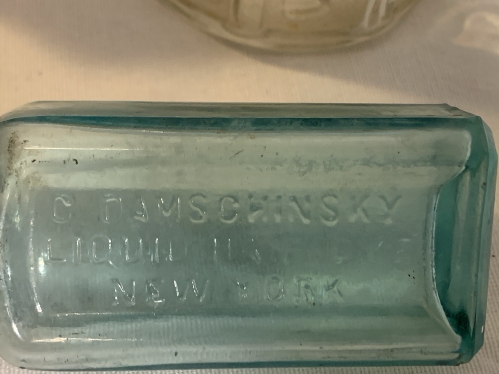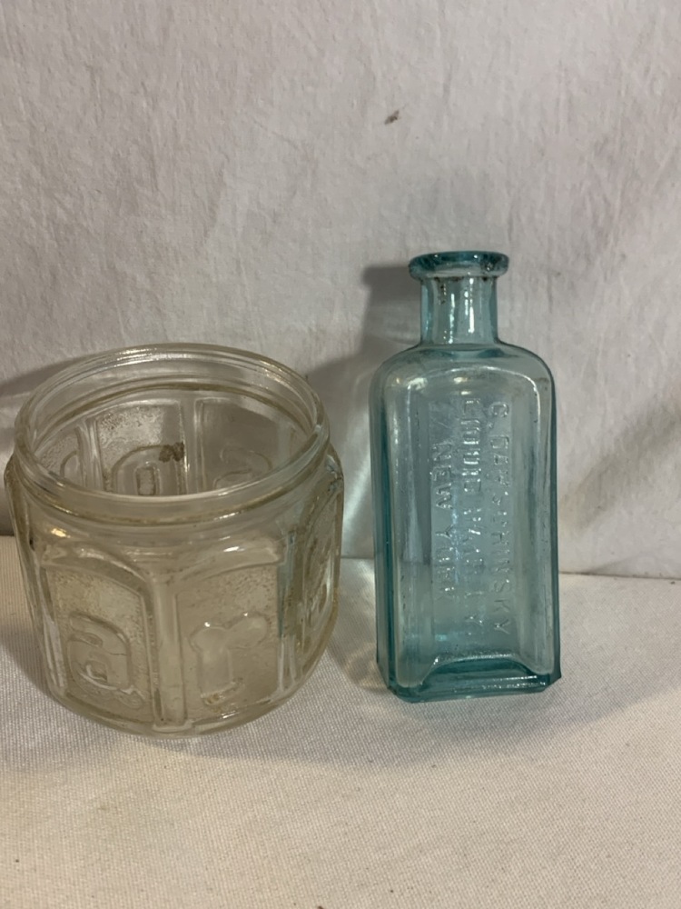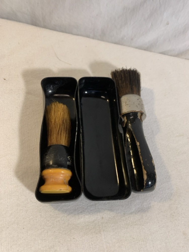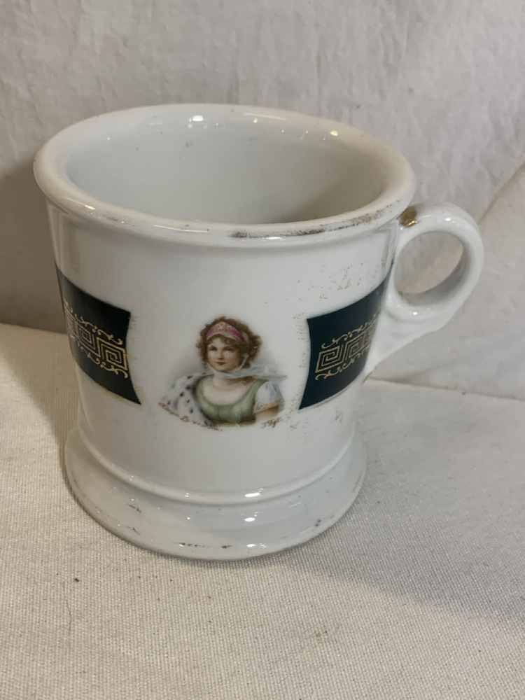 Antique Barber Bottles, Shaving Mugs, & Brushes including Witch Hazel Bottle, Barbasol Jar, Hair Dye Bottle, Shaving Mugs, Horse Hair Brushes, Talc Shaker