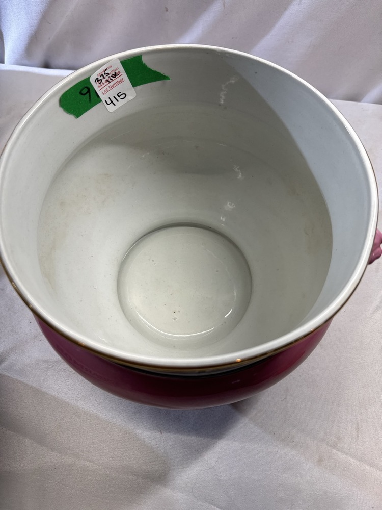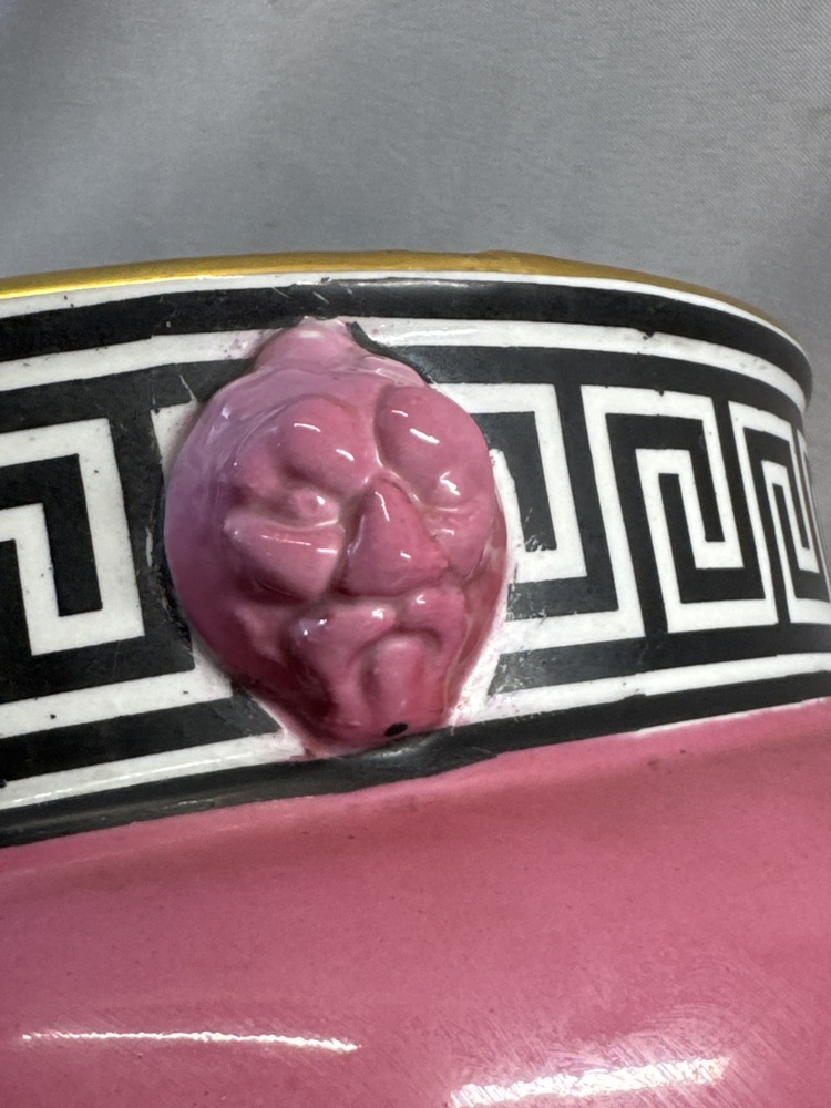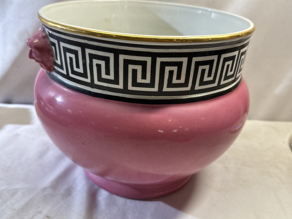Vtg Westhead Moore Pink Jardiniere with Greek Key Motif & Face Handles- 9” Openingx 8” T, Approx. 10” Round