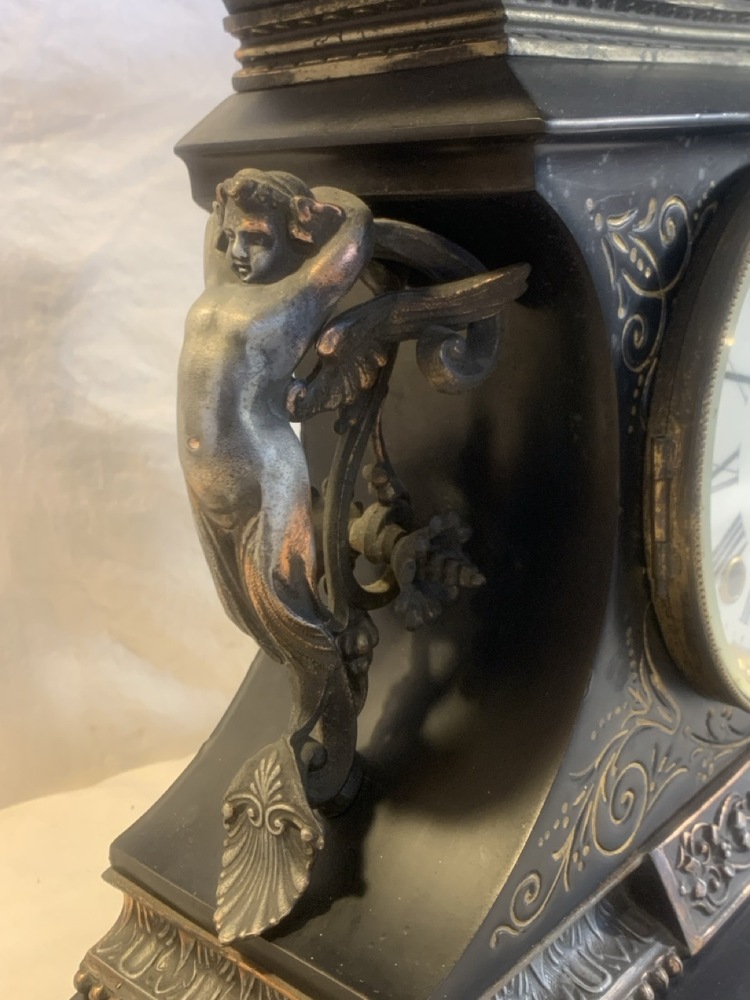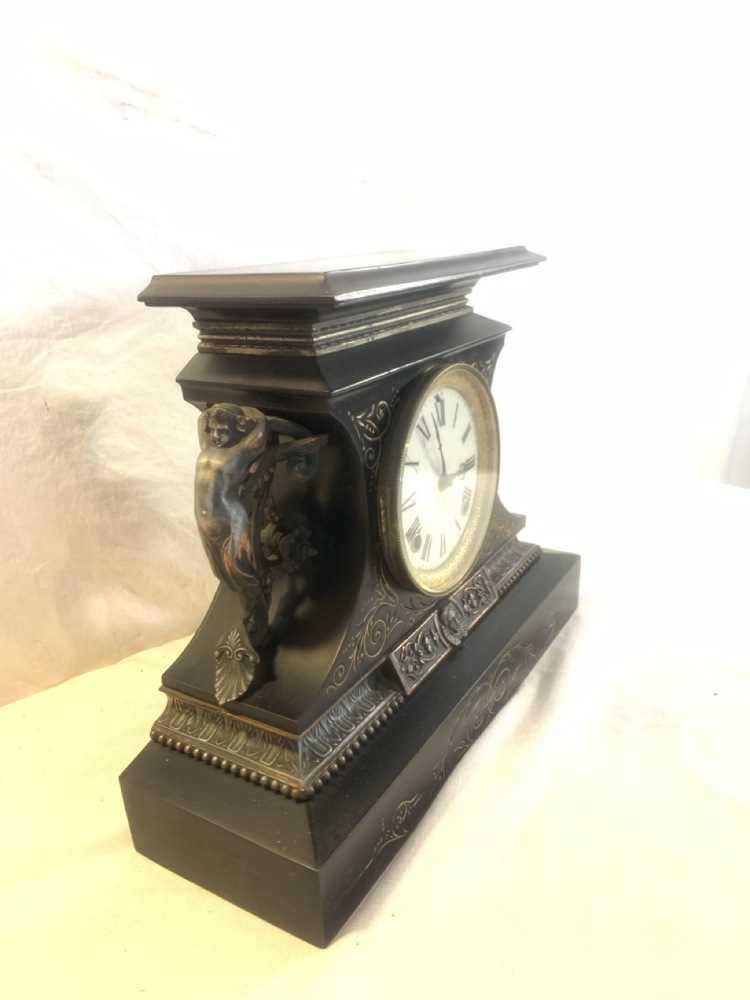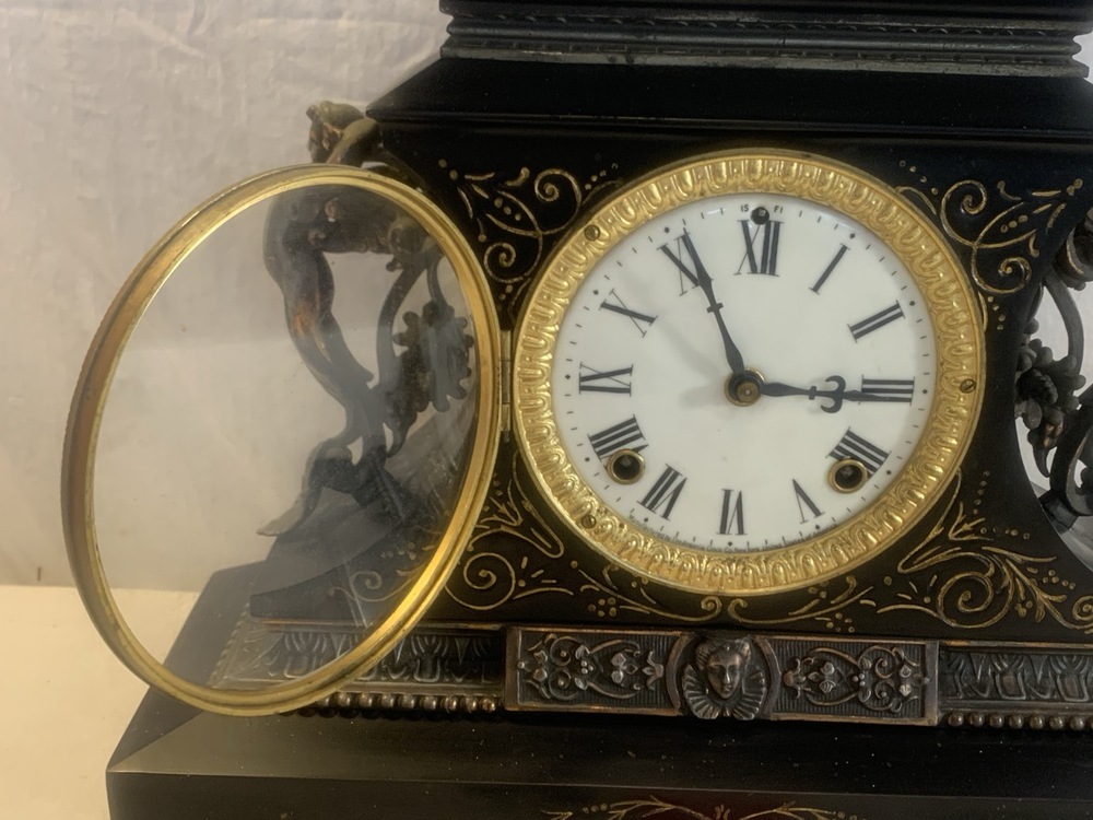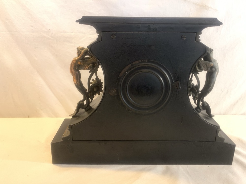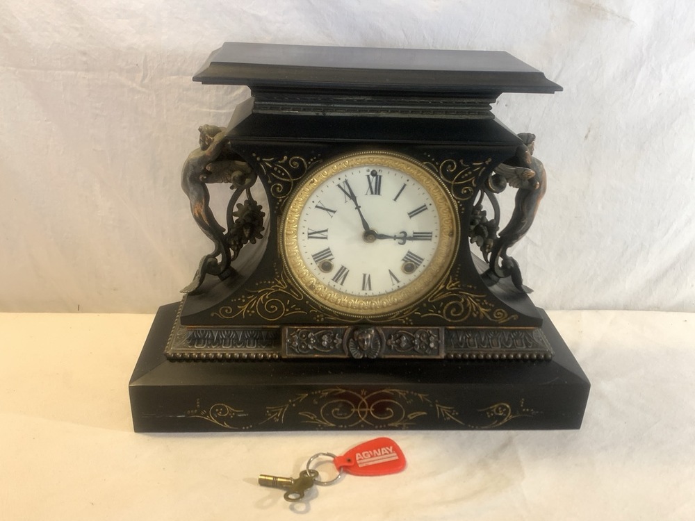 Antique Ansonia Mantle Clock Made By Ansonia Clock Co. ~ Cast Metal with Gold Gilded Figures~ Works and has Key ~ 15 1/4” x 5 1/4” x 12” Tall