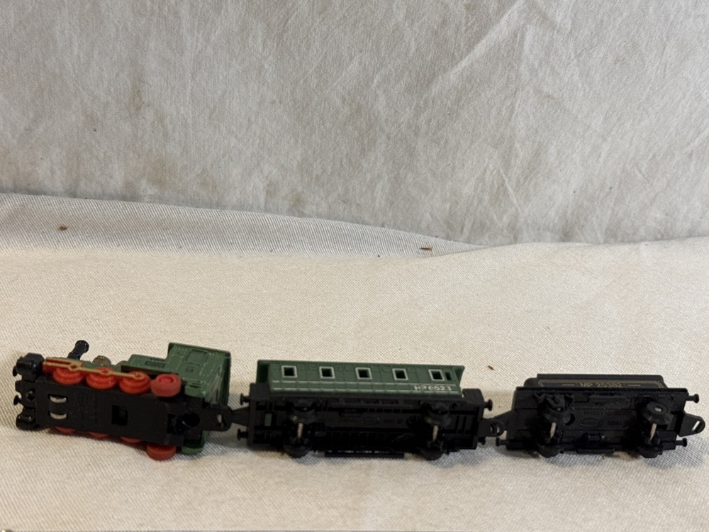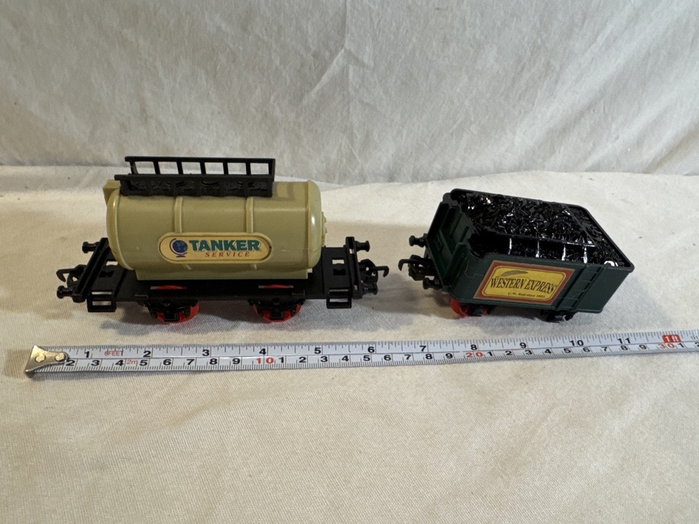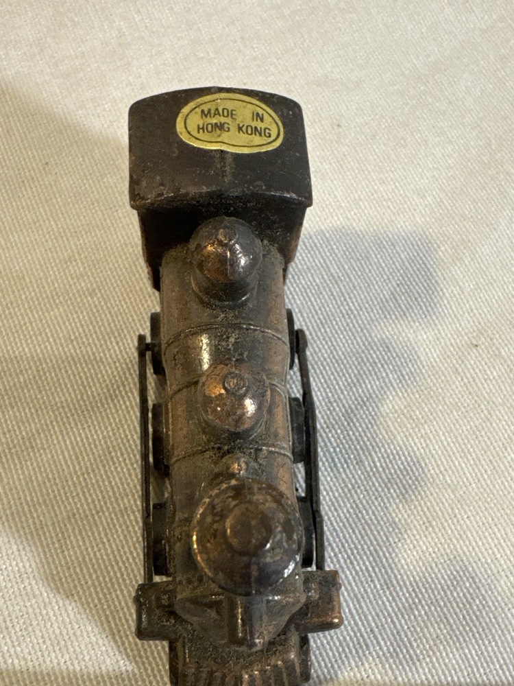 Vtg Trains Lot including 2- Hot Wheels Express 454 Locomotive Engines, 2- No. Passenger Cars, No. 15 Car Carrier, Goldlok Tanker & Coal Car, 2 Brass Pencil Sharpeners, 1989 Soma pull Back Motion Train Set & Marx Dump Trailer