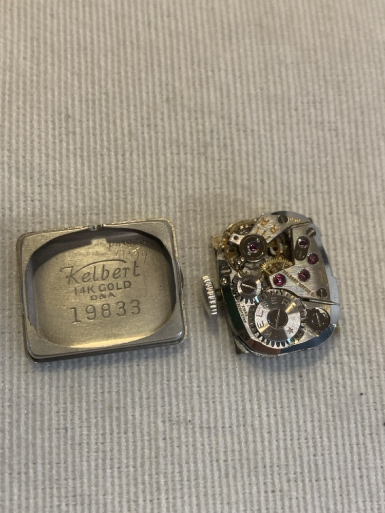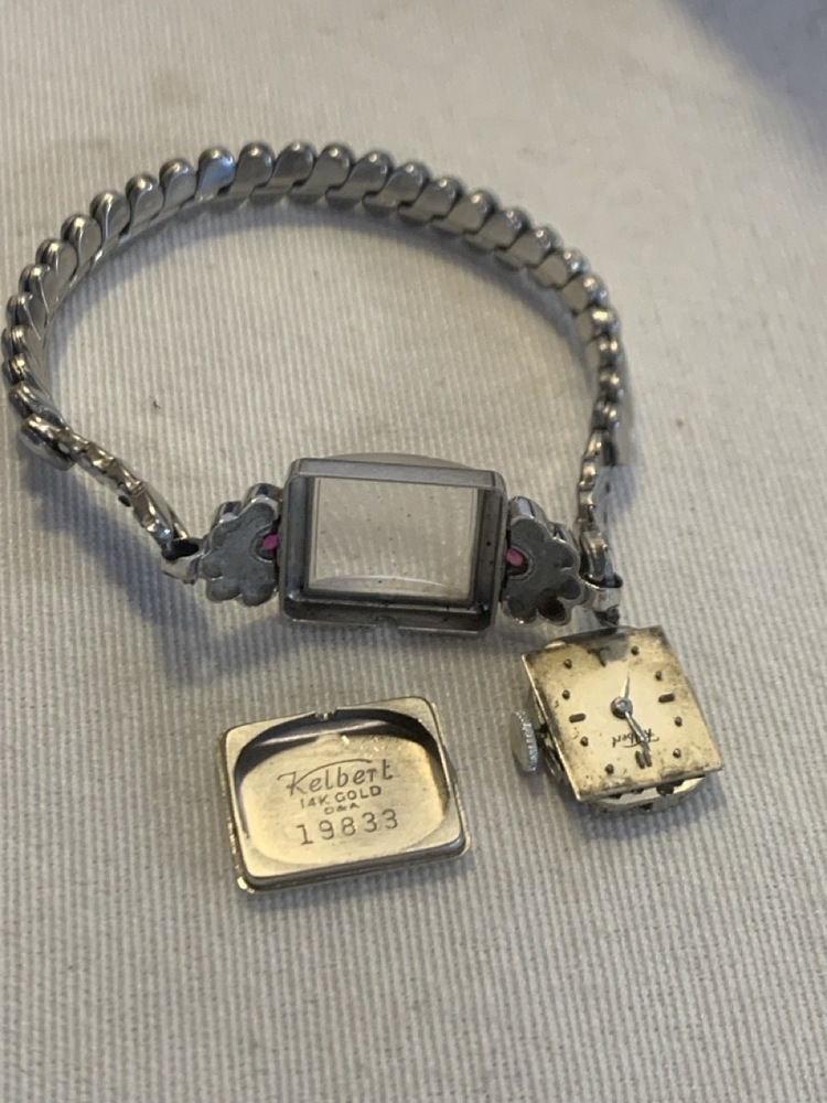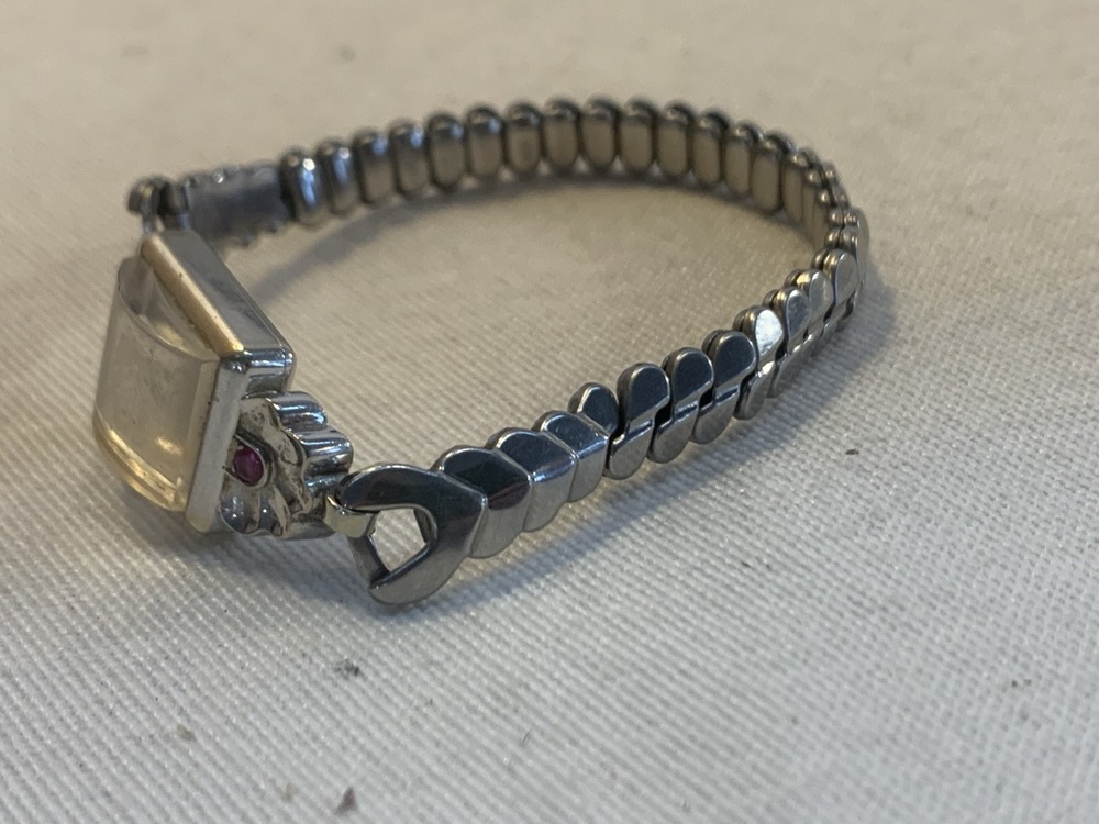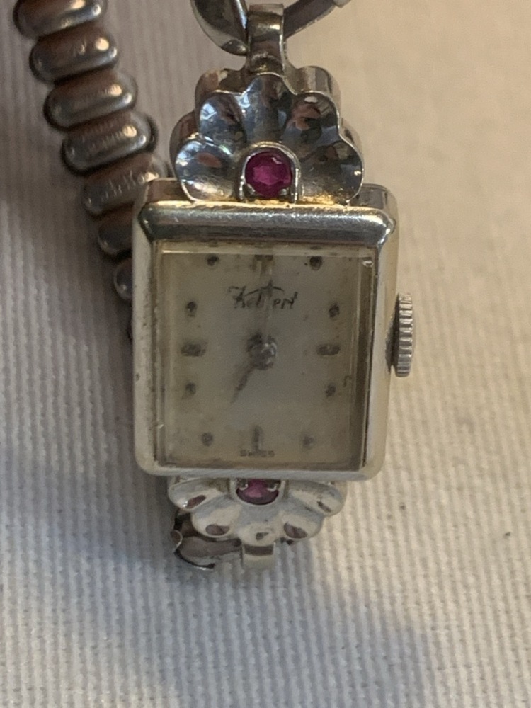 Kelbert Solid 14k Gold Watch with Ruby Stones ~ 17 Jewels ~ Band is Topps Stainless Steel - 15.6 Total Grams