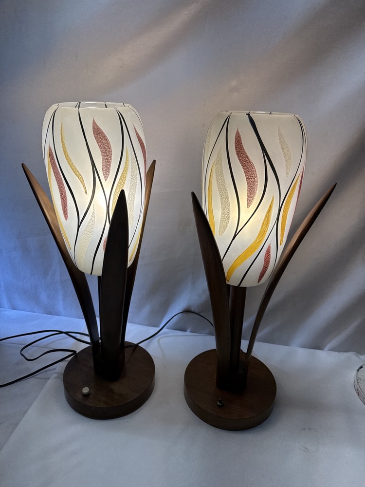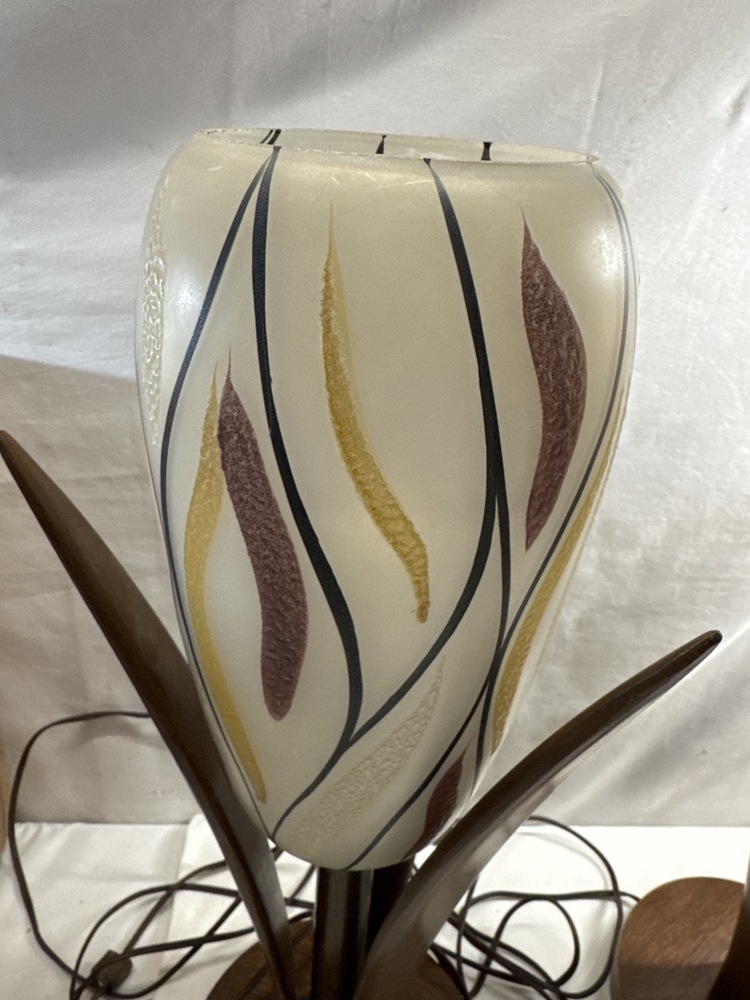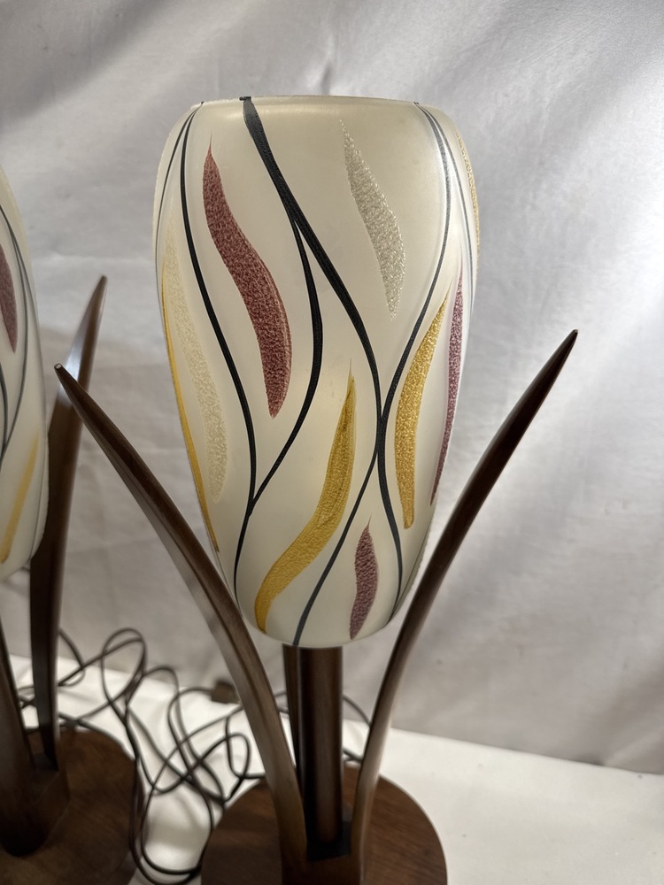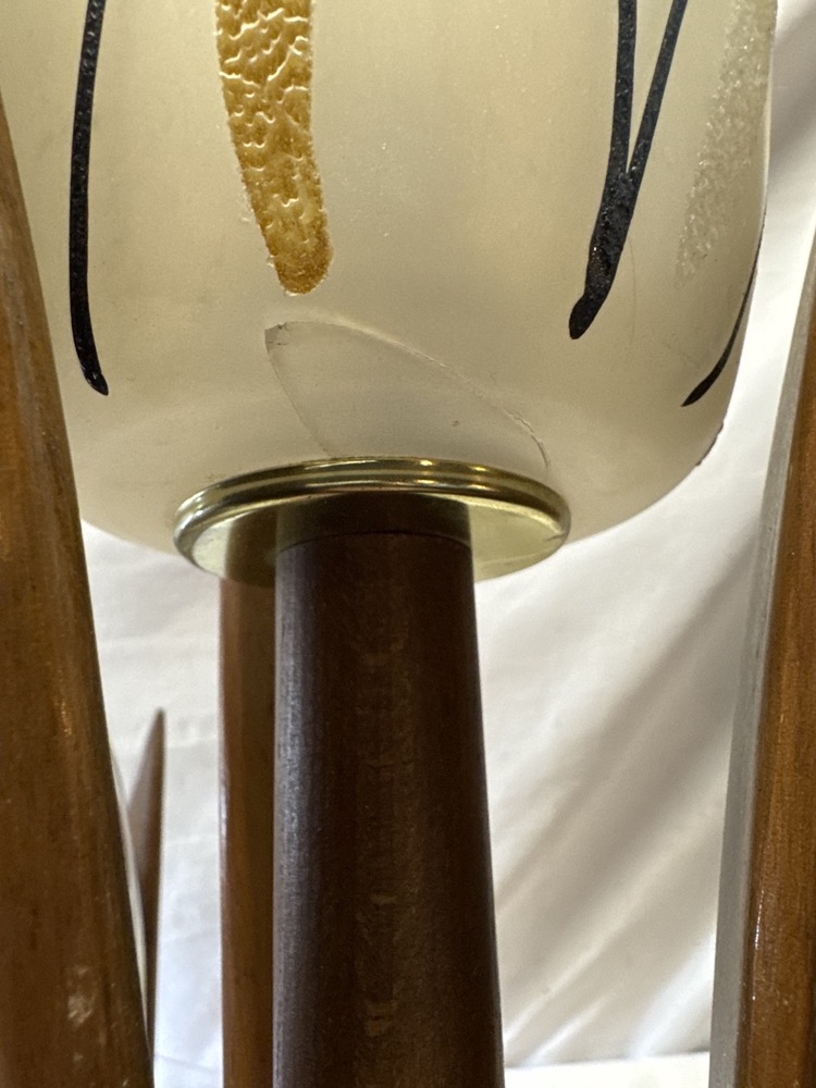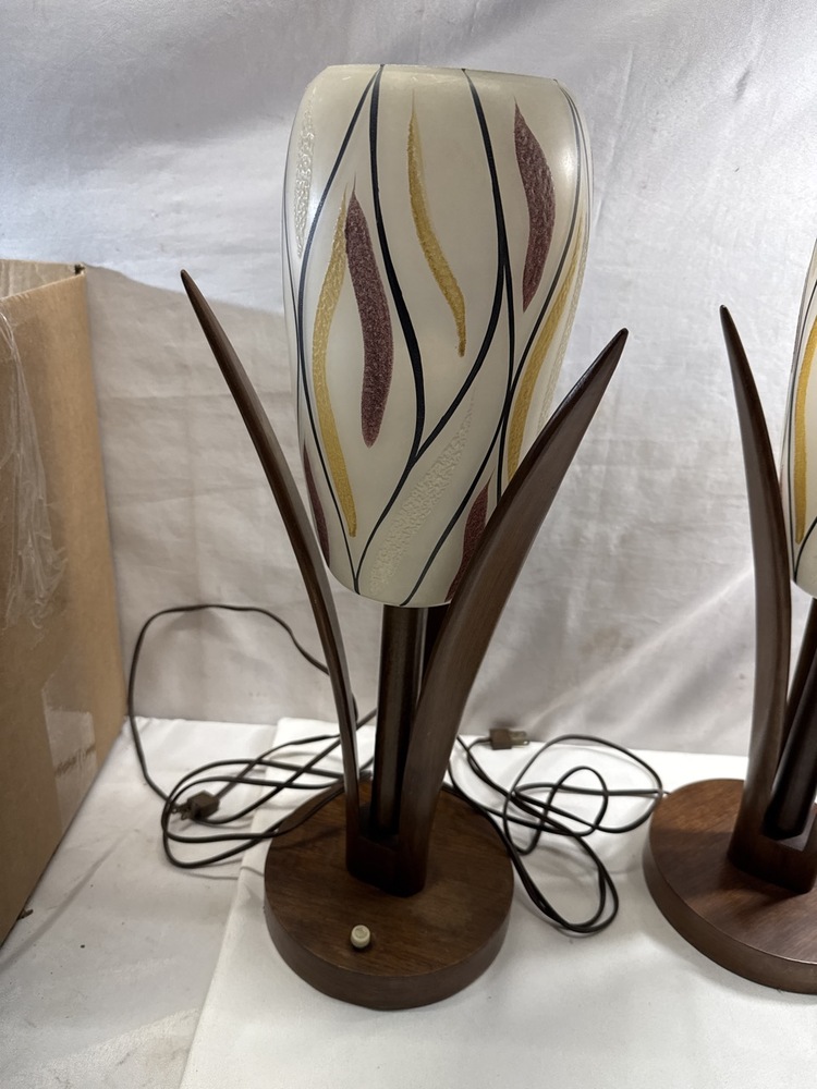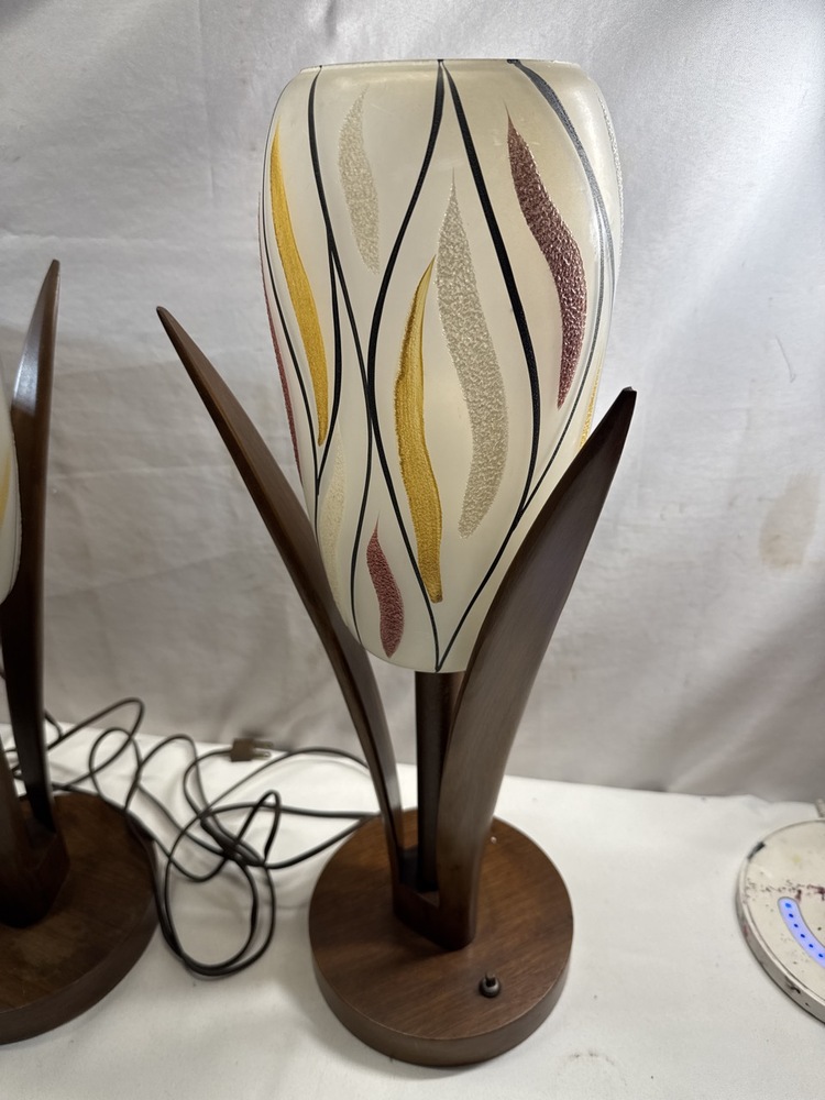 MCM Walnut Table Lamps W/ Glass Shades- 21” T- 1 Shade Has Been Repaired