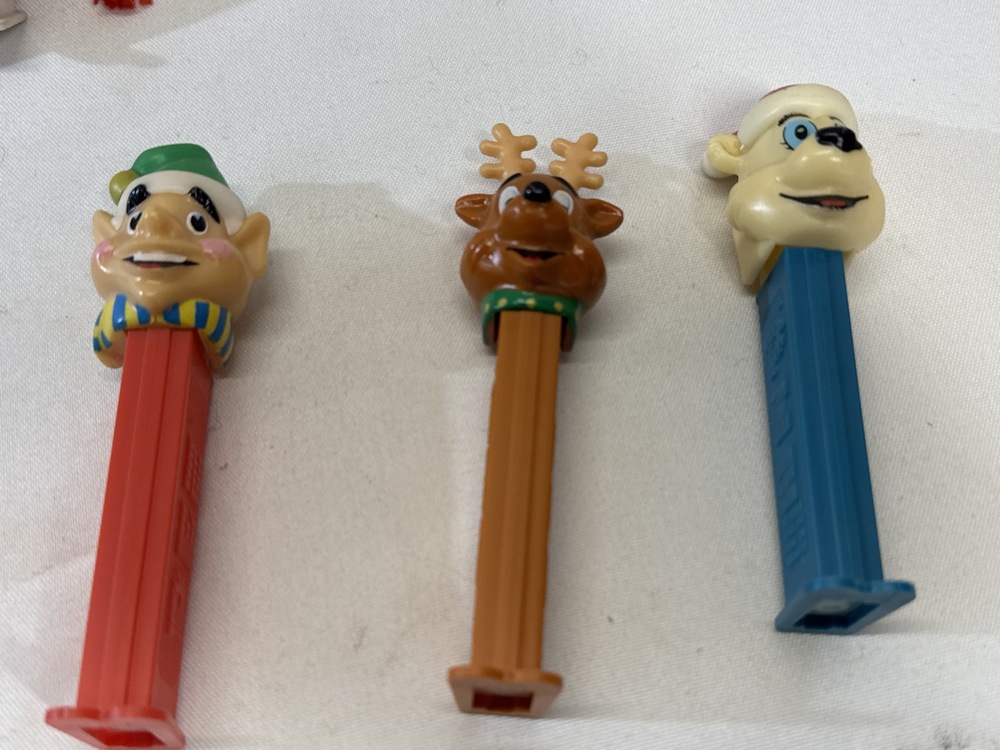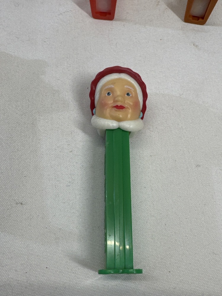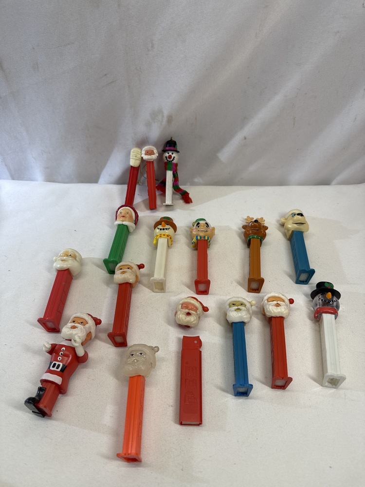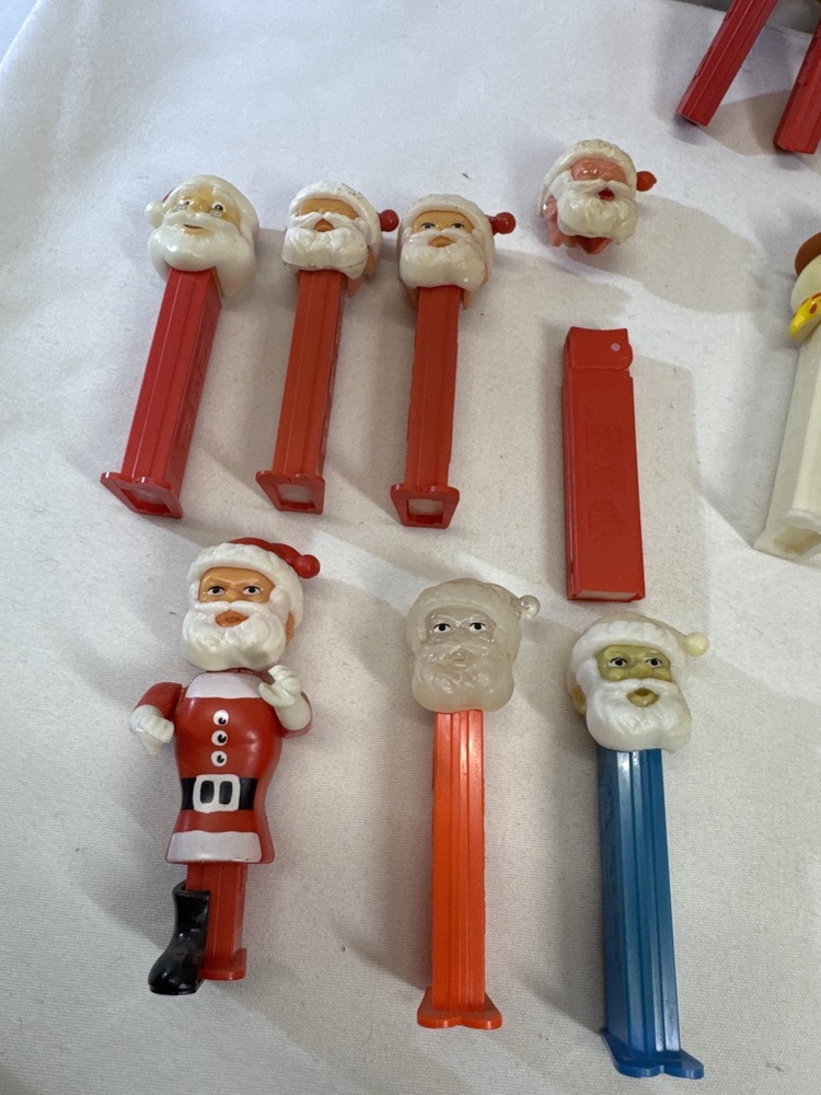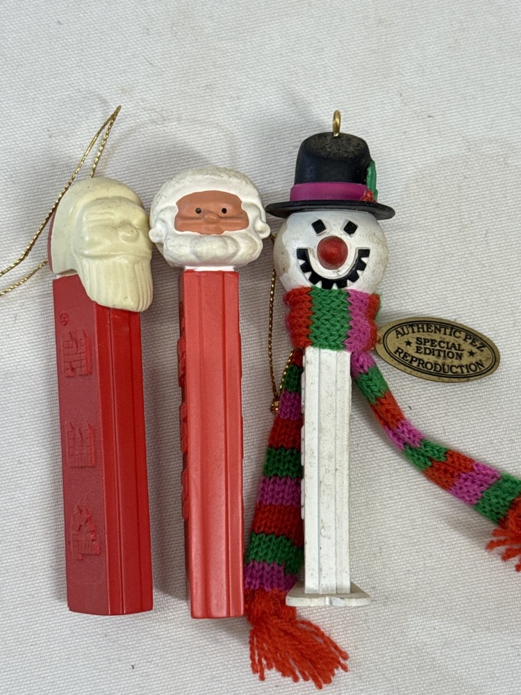 Vtg Christmas Themed Pez Dispensers including Santa Claus(including Colorless Crystal Santa), Mrs Claus, Snowman, Elf, Reindeer, 3- Ornaments