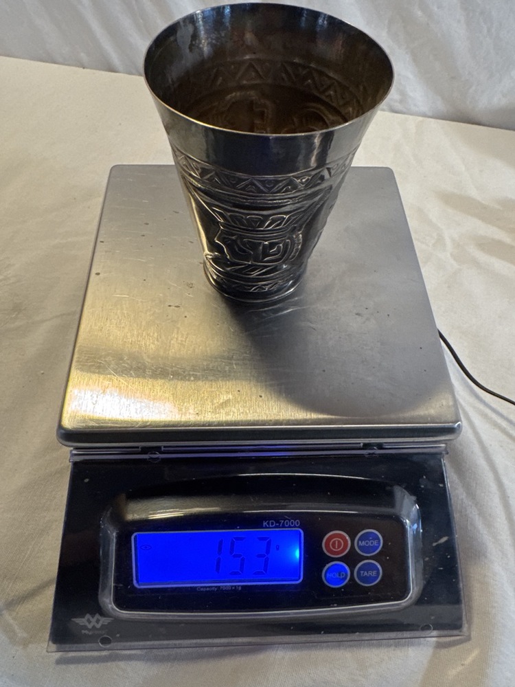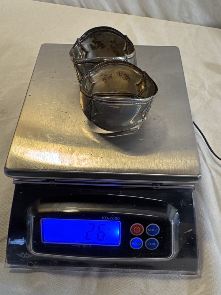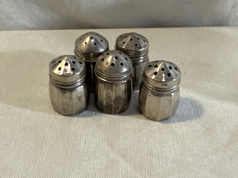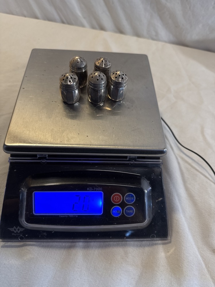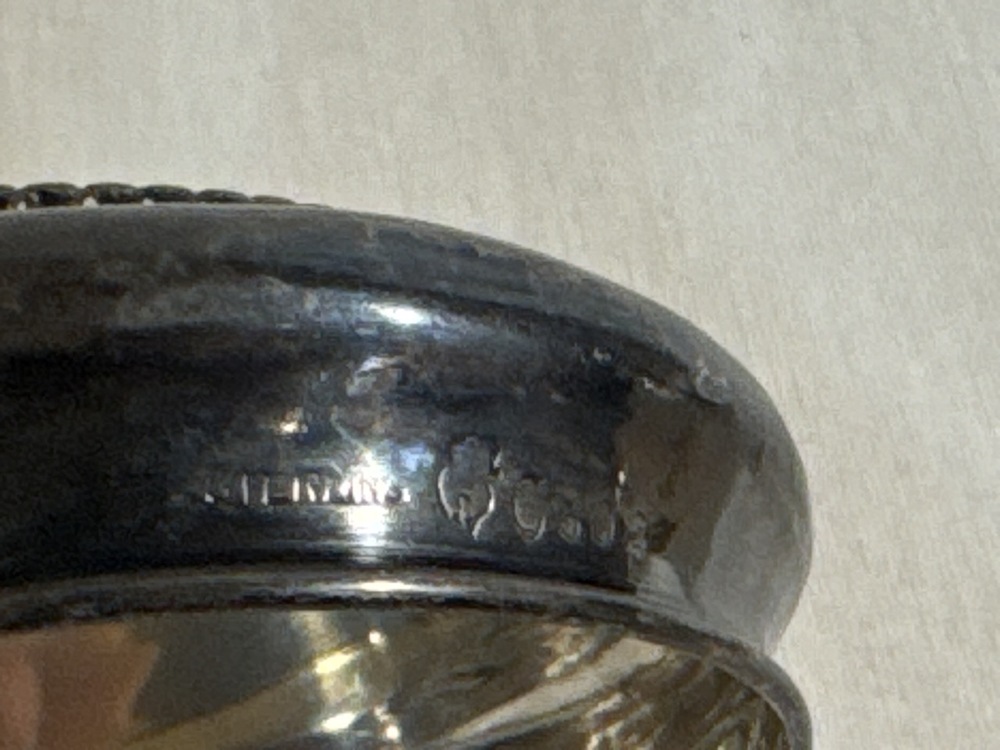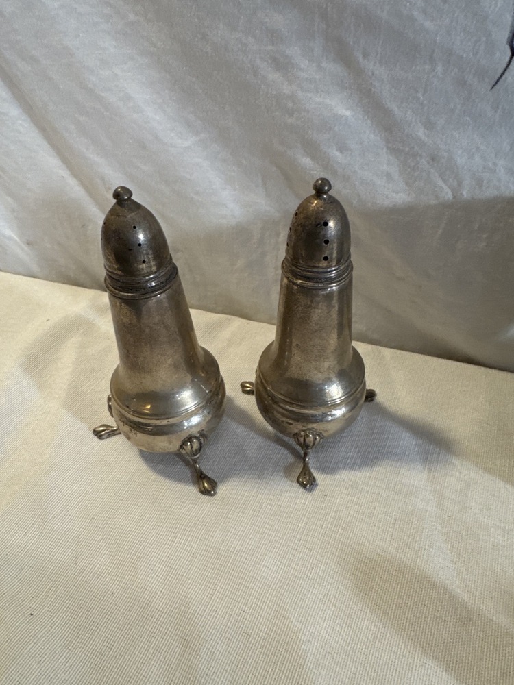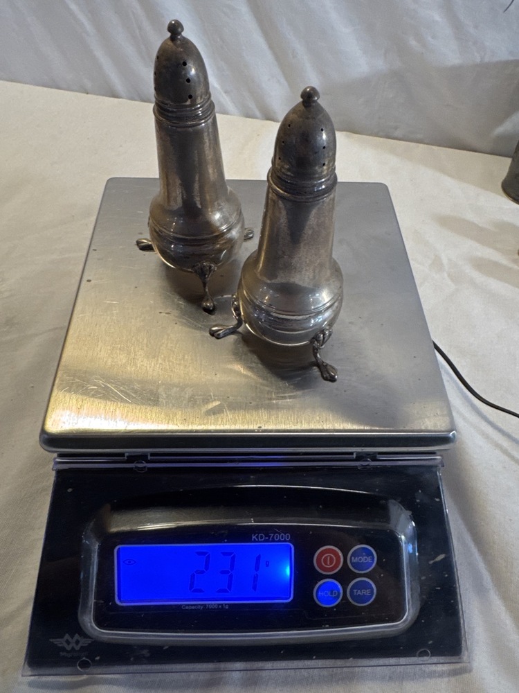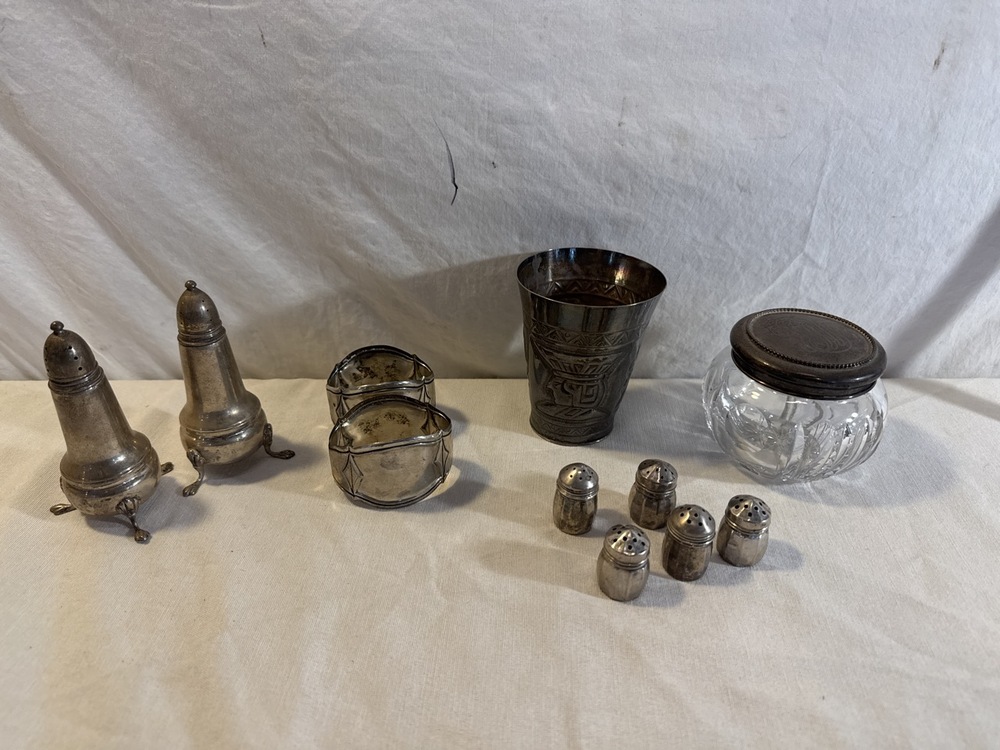 Sterling Silver Lot including Crown Footed S&P Shakers 231 Grams, Kohler Peru Cup 153 Grams, Napkin Rings marked OCB 26 Grams, 5 S&P Shakers 20 Grams, Crystal Jar with Sterling Top 33 Grams- 463 Grams Total