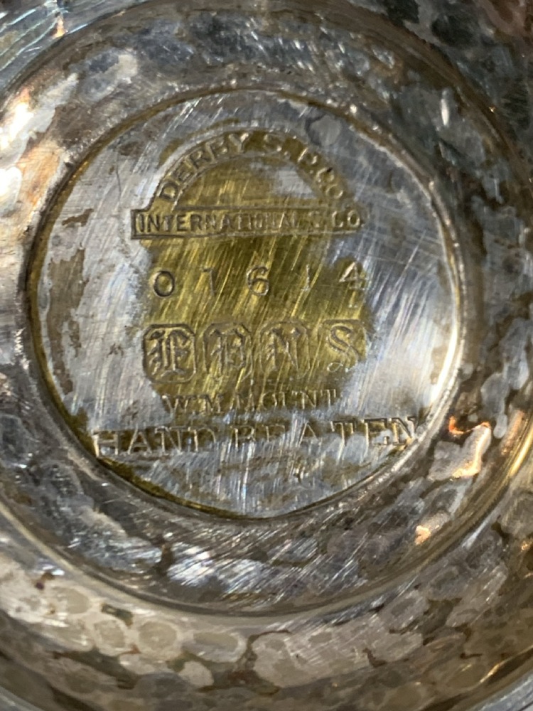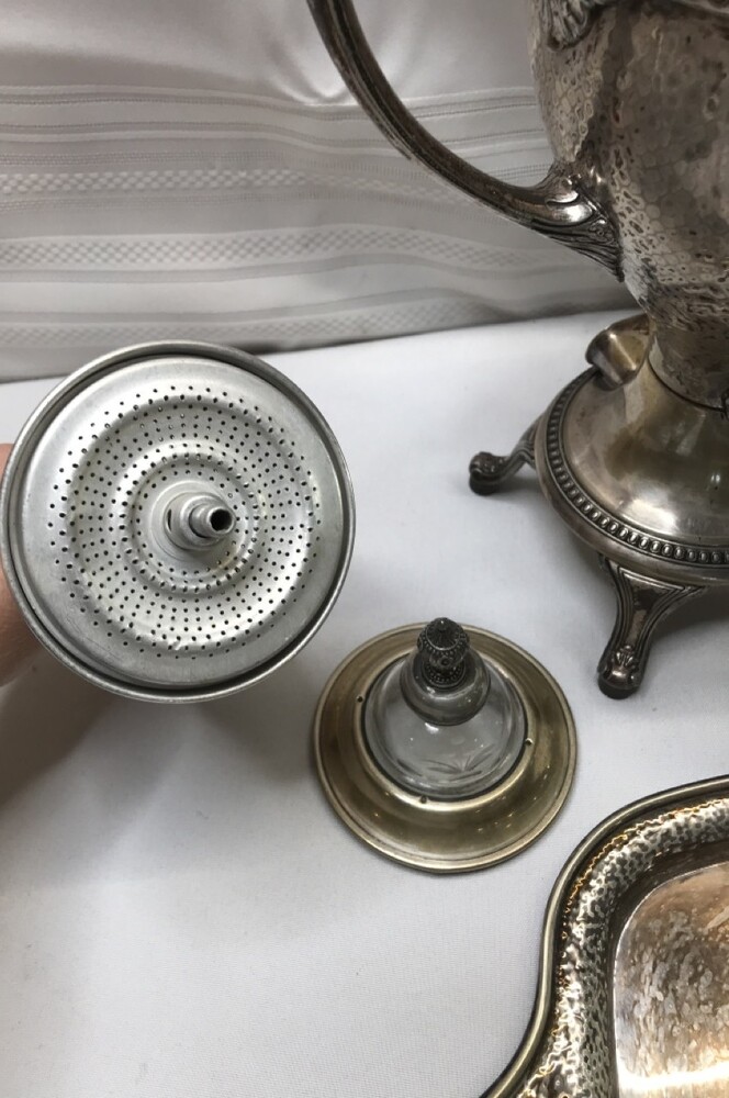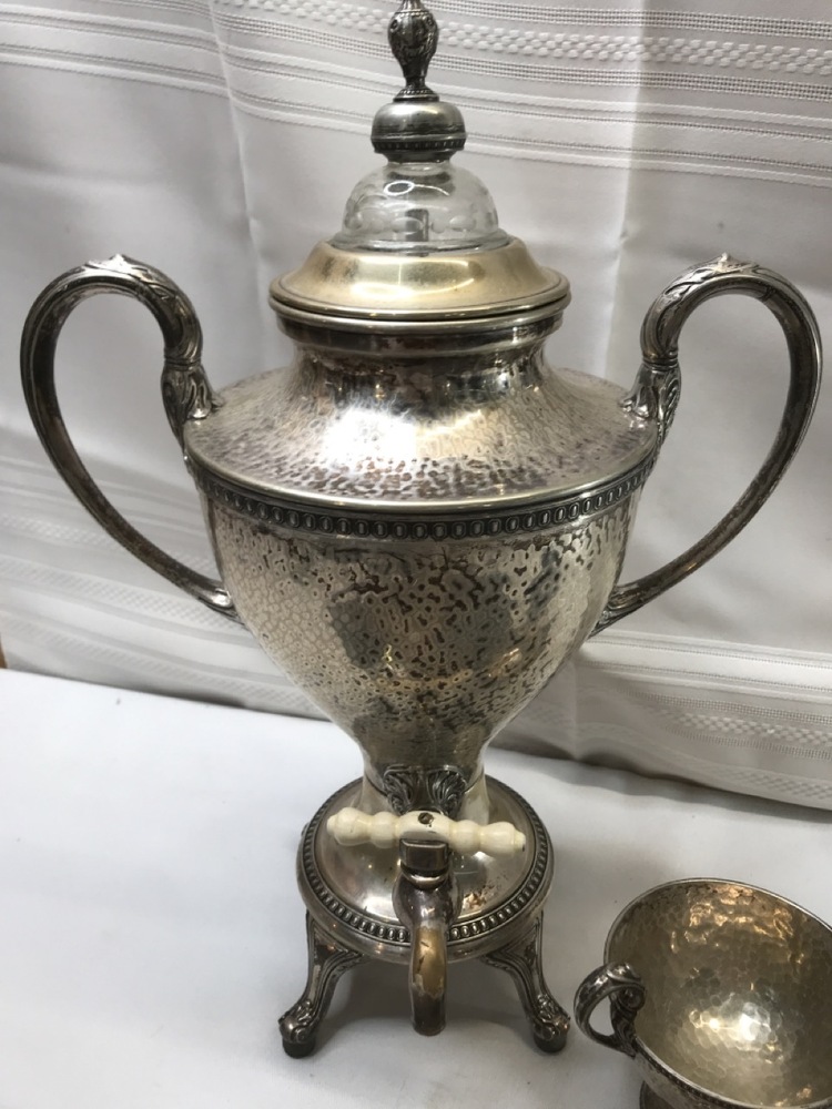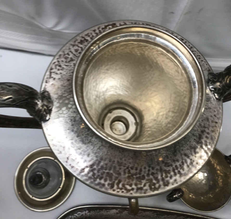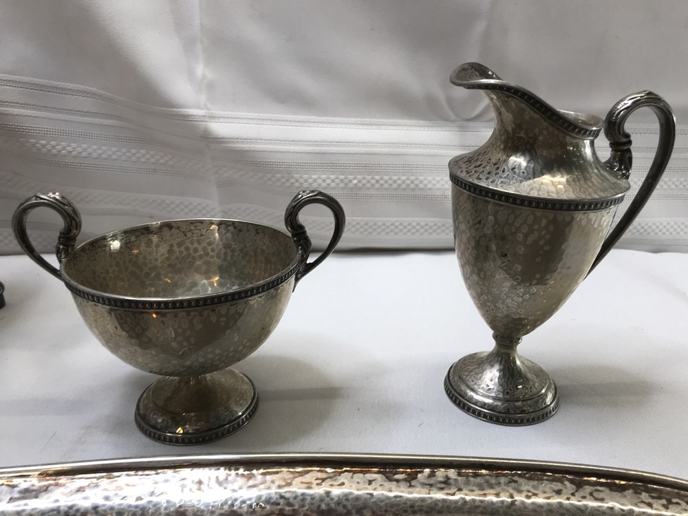 Vintage Derby SP Co International Hand Beaten Hammered Finish Silver Plate Coffee Urn, Creamer Sugar and 20" tray