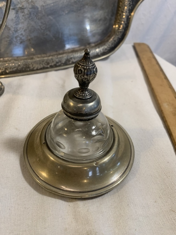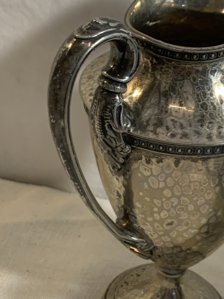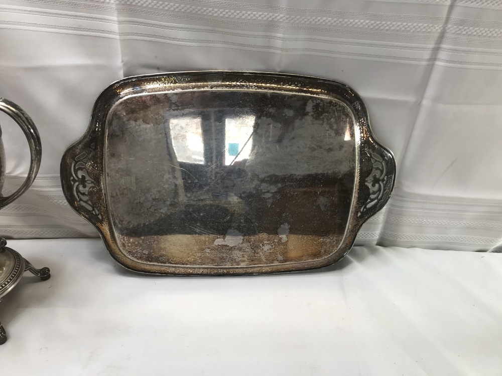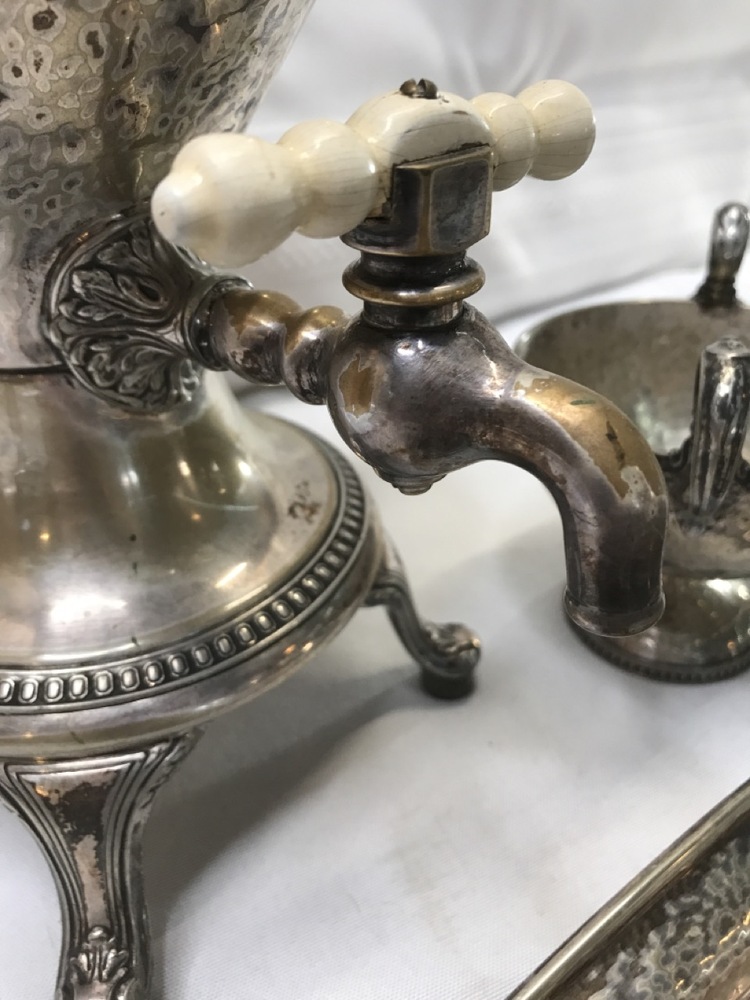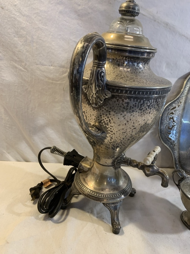 Vintage Derby SP Co International Hand Beaten Hammered Finish Silver Plate Coffee Urn, Creamer Sugar and 20" tray